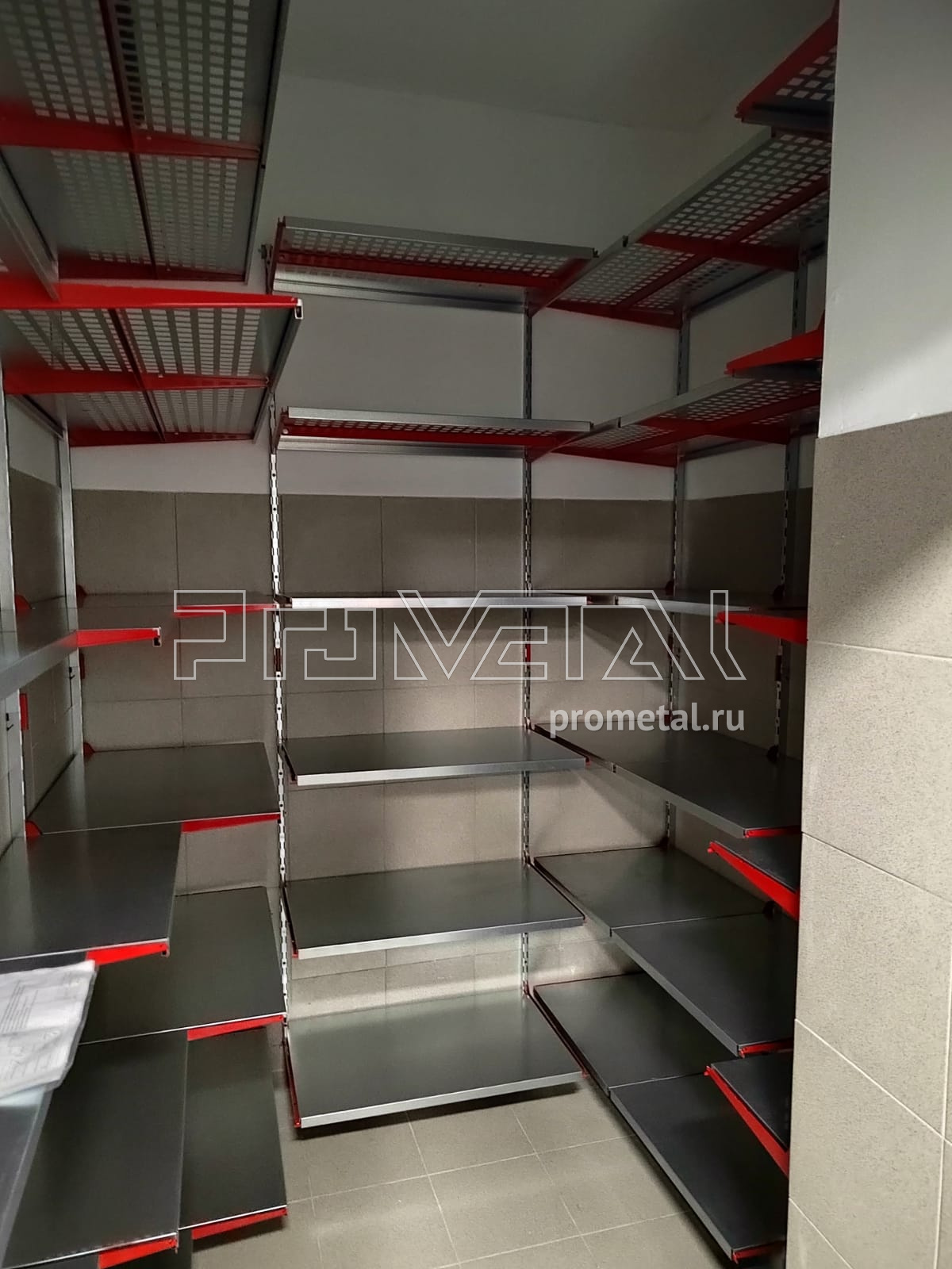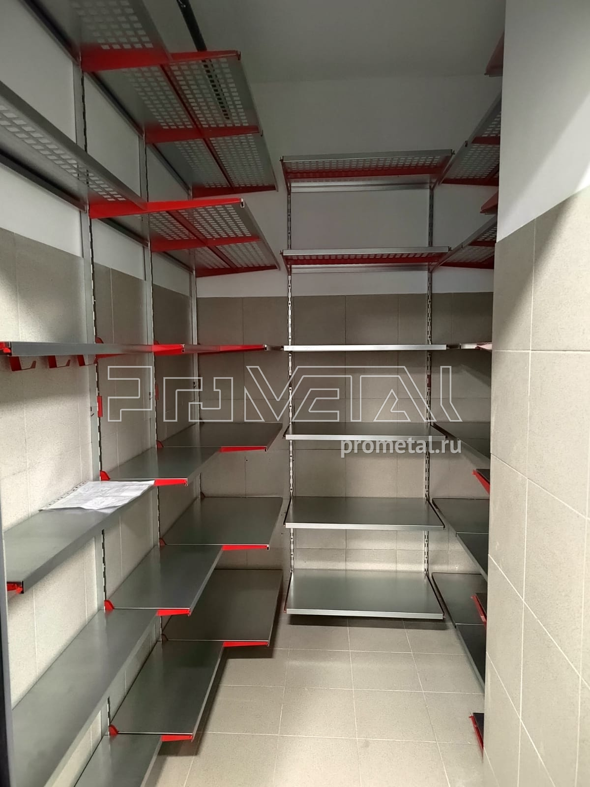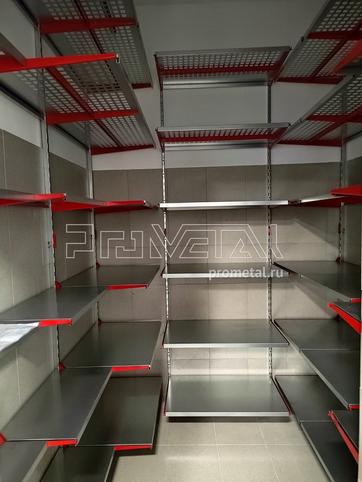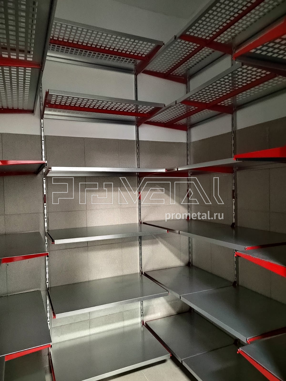Проект получился достаточно стандартный для кладовых. Верхнюю площадь стен занимают полки с перфорацией, усиленные рёбрами жёсткости. На них удобно хранить коробки, различные вещи в пластиковых боксах. На нижних рядах мы расположили цельные полки. В проекте были задействованы полки разных размеров для удобной эксплуатации кладового помещения. На входе мы предусмотрели несколько крюков на полку под различный хоз.инвентарь.