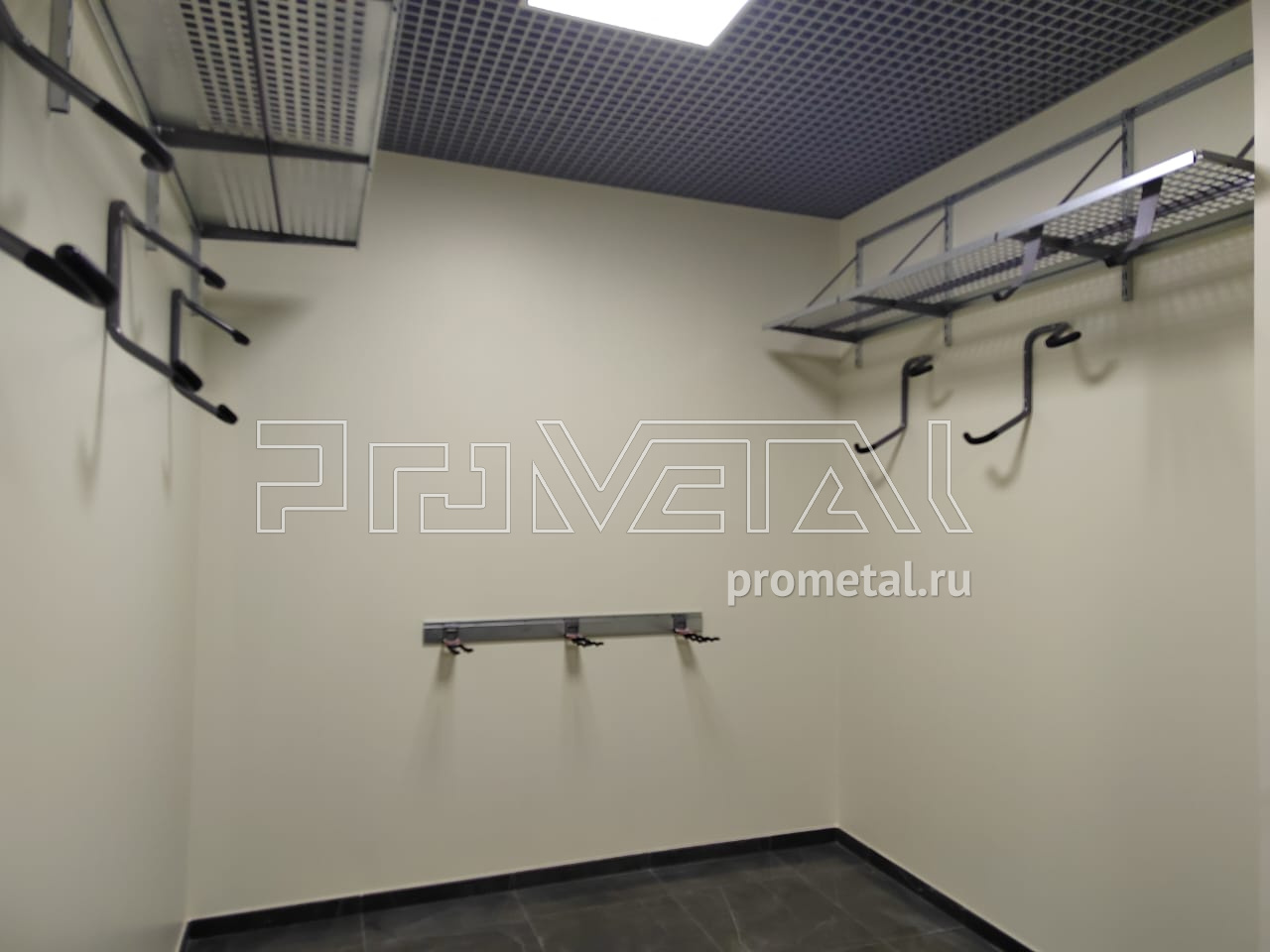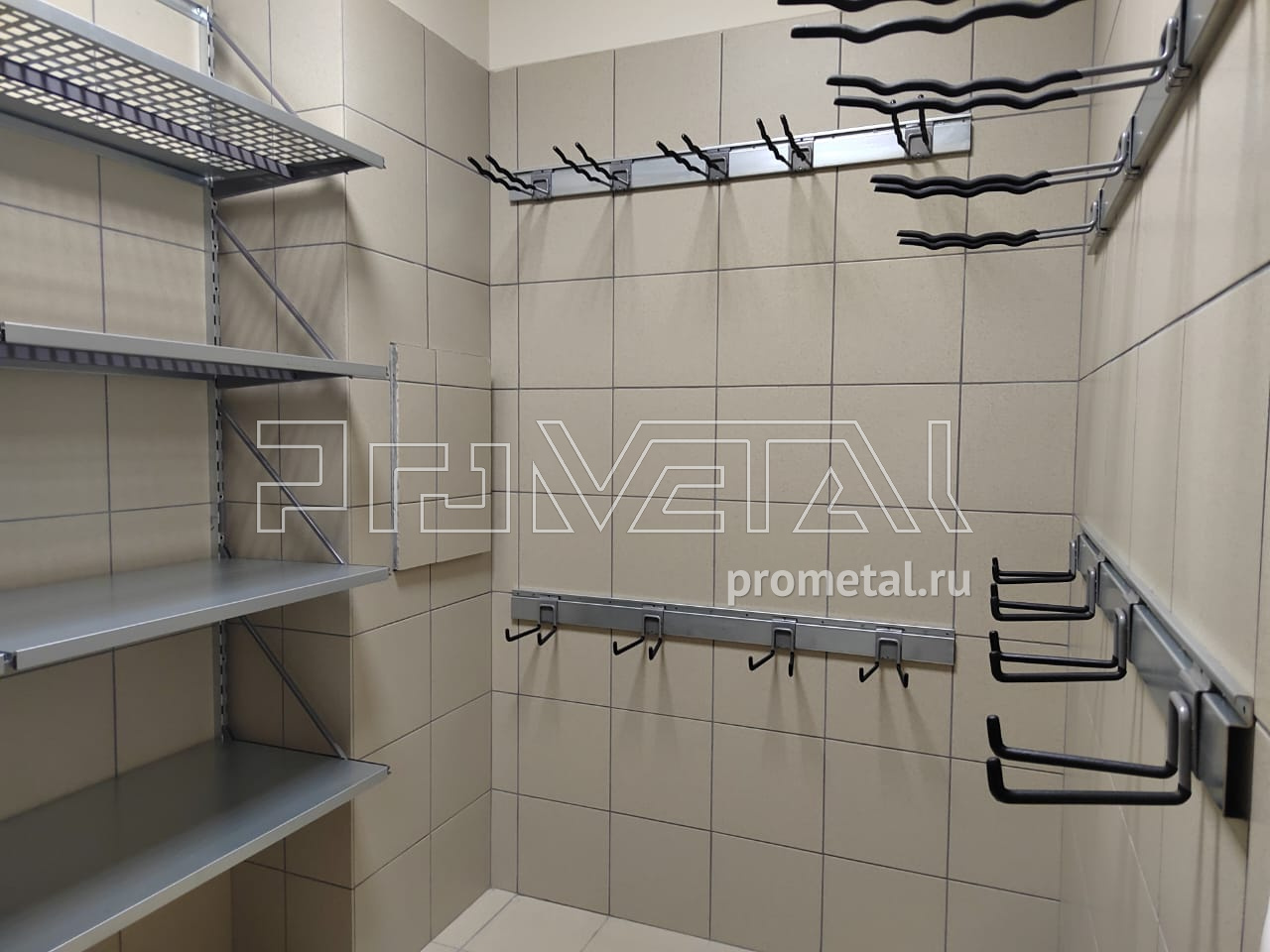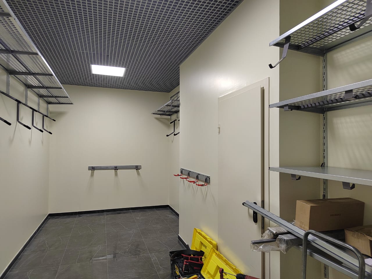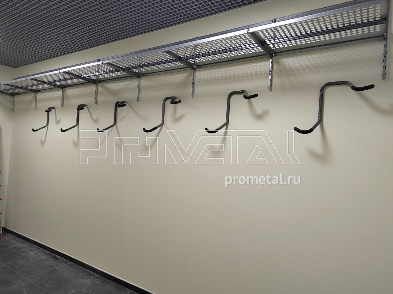 Вторая кладовая обустроена под хранение велосипедов. Верхняя площадь стен оборудована полками с перфорацией 520мм, усиленными аналогично первой кладовой. На оставшейся площади расположили крюки для двух велосипедов. Аналогично, предусмотрены рейлинги с крюками Эссе. У входа, слева, стену оборудовалиперфорированными и цельными полками глубиной 520мм, на ней предусмотрели крюки на полку для велосипеда.