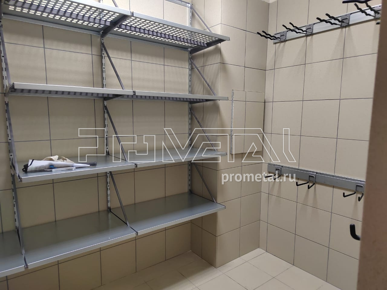 В проекте две кладовки, начнём с первой. Стандартная кладовая, центральная стена оборудована полками глубиной 520мм, верхний ряд - с перфорацией, нижние - цельные. Все полки усилены рёбрами жёсткости и усилителями кронштейнов, для хранения тяжёлых вещей. Справа и слева предусмотрели рейлинги с крюками Эссе, для хранения различного хозяйственного инвентаря.