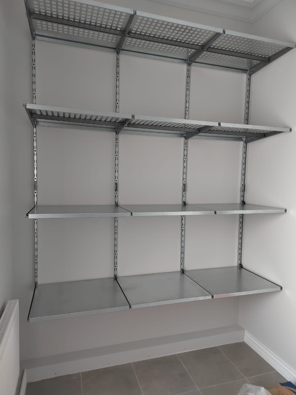В проекте обустроили две стены кладовой, заказчик попросил сделать 4 ряда навесных полок, пол нужно было оставить свободным. 2 верхних ряда полок выполнены с перфорацией, нижние ряда - цельные, все полки глубиной 520мм. Перфорация позволяет увидеть снизу что лежит на верхних полках, частично пропускает свет, также на таких полках не скапливается пыль. Полки глубиной 520мм отлично подходят для хранения коробок, пластиковых боксов, чемоданов и других габаритных вещей. Перфорированные полки дополнительно усилены рёбрами жёсткости.