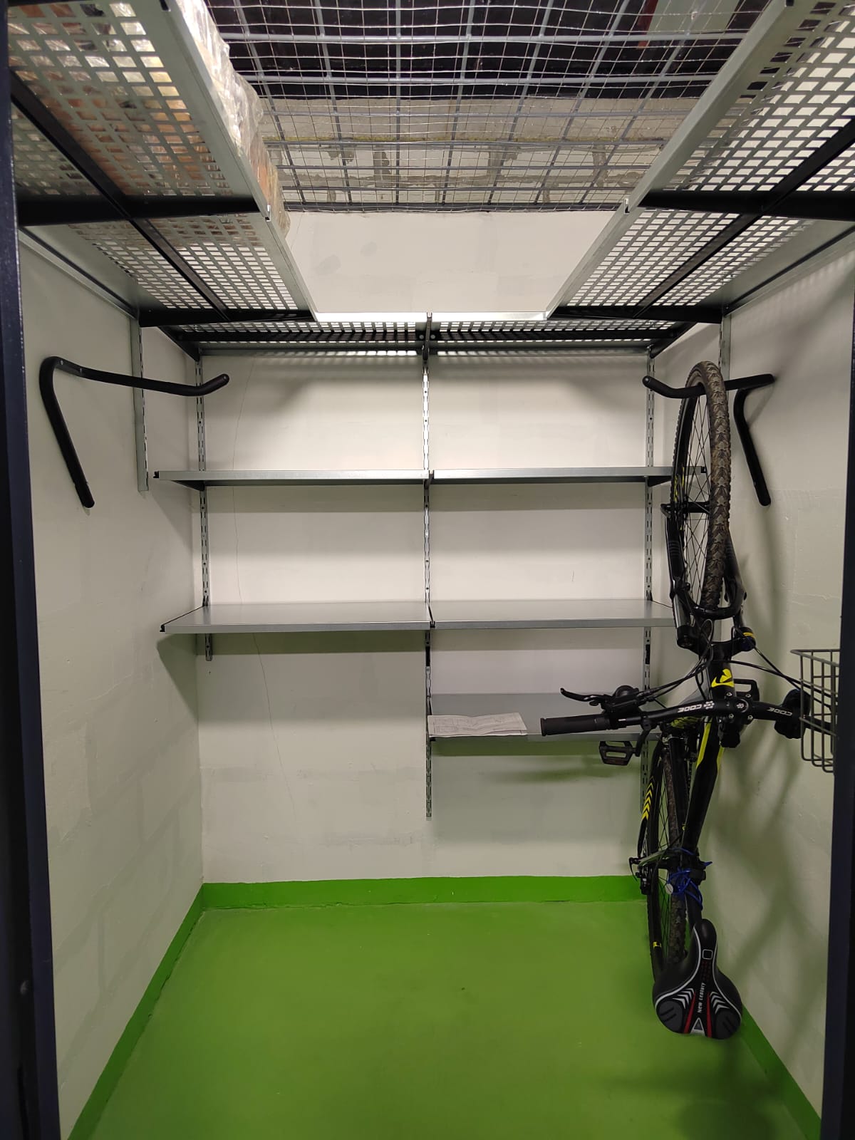 Основную площадь стен кладовой занимаем полками. На всех стенах верхний ярус оборудован полками с перфорацией глубиной 520мм. На центральной стене ниже идут 3 ряда цельных полок глубиной 520мм. Такие полки хорошо подходят для хранения коробок, пластиковых боксов и других крупных вещей. Предусмотрены 2 крюка 1 Вело на стену, для велосипедов. Ближе ко входу предусмотрели рейлинг с металлическими корзинами и крюками Эссе, для хранения различного хозяйственного инвентаря, в том числе стремянки. Все пожелания заказчика были учтены.