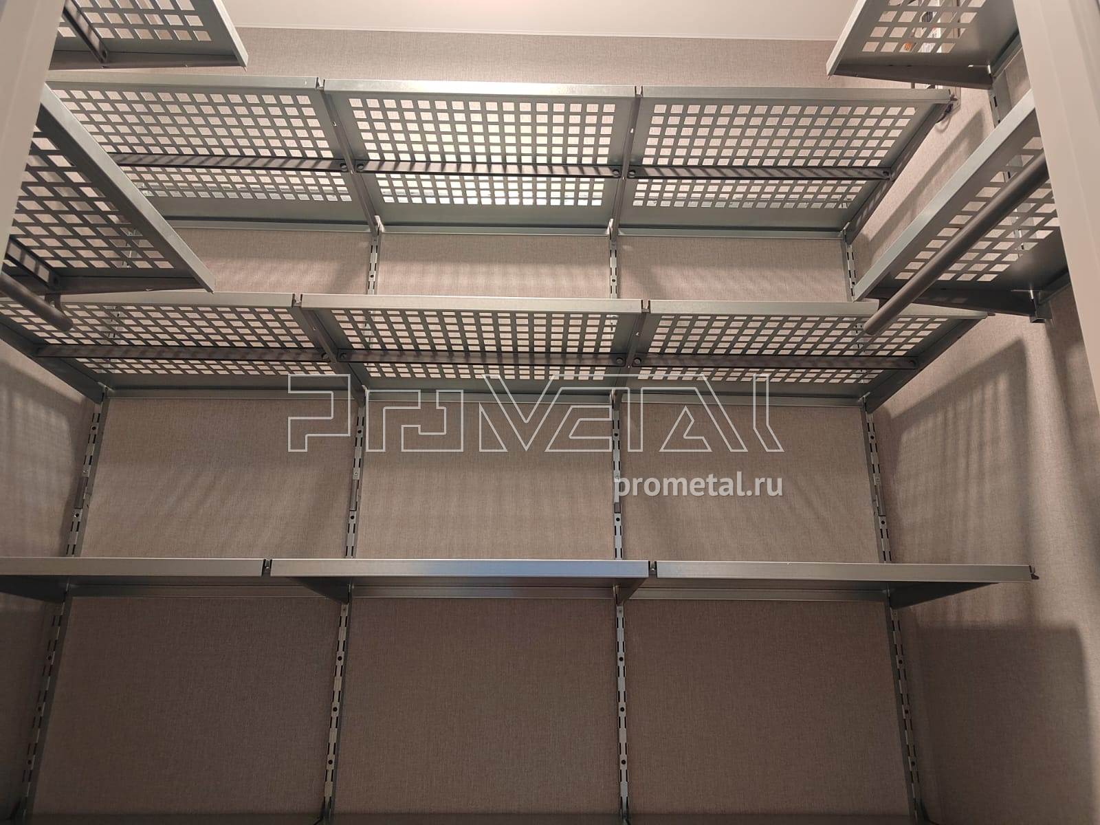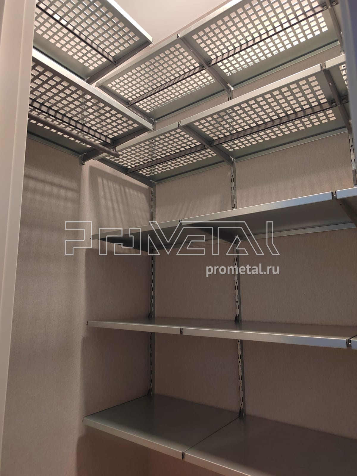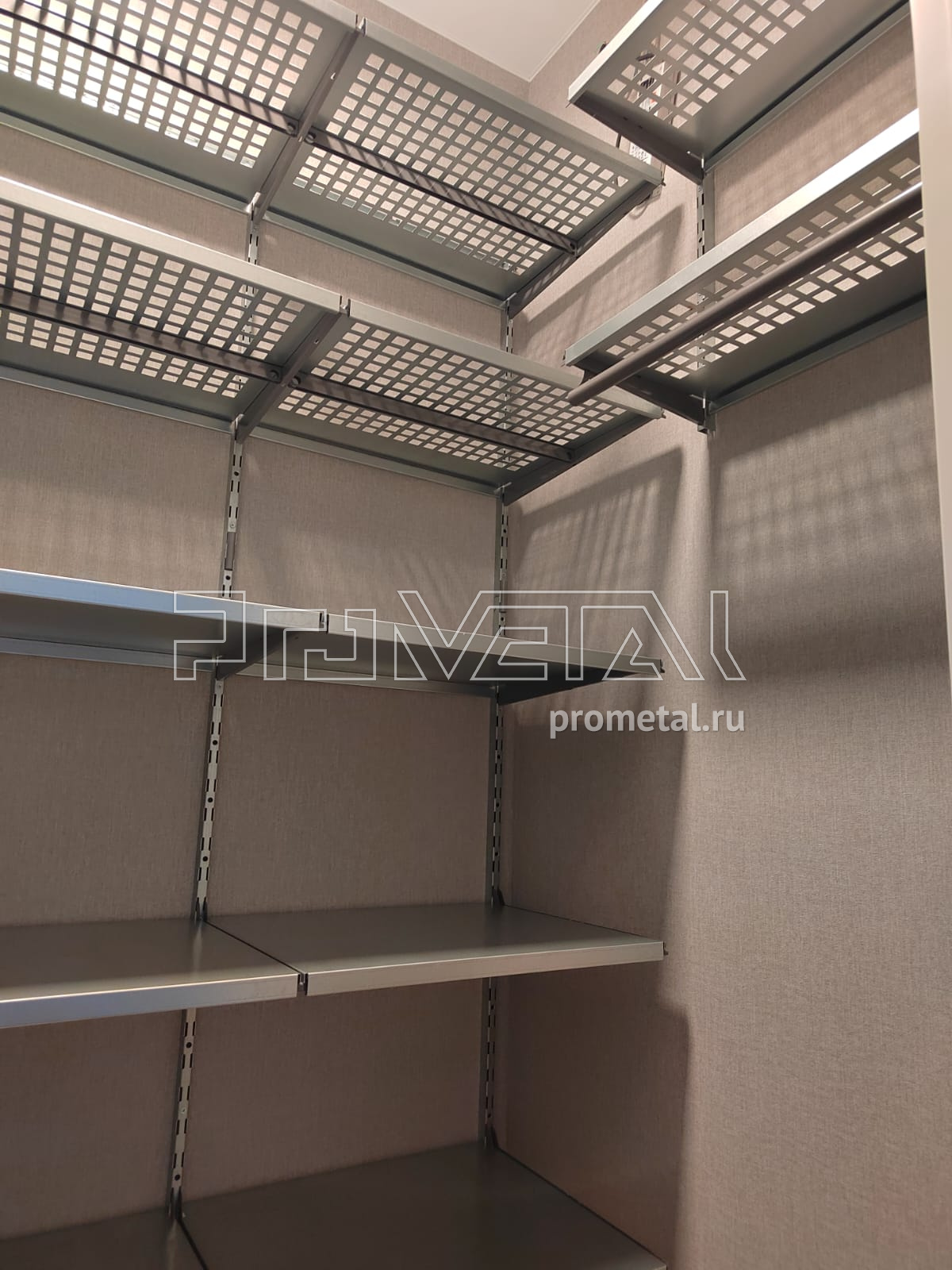 Перейдём к кладовке. Центральная и левая стена оснащены глубокими полками 520мм. Верхние ярусы с перфорацией, нижние - цельные. Все перфорированные полки усилены рёбрами жёсткости. Правая стена оборудована полками 315мм, аналогично. Предусмотрены 2 штанги под плечики, для хранения одежды.
