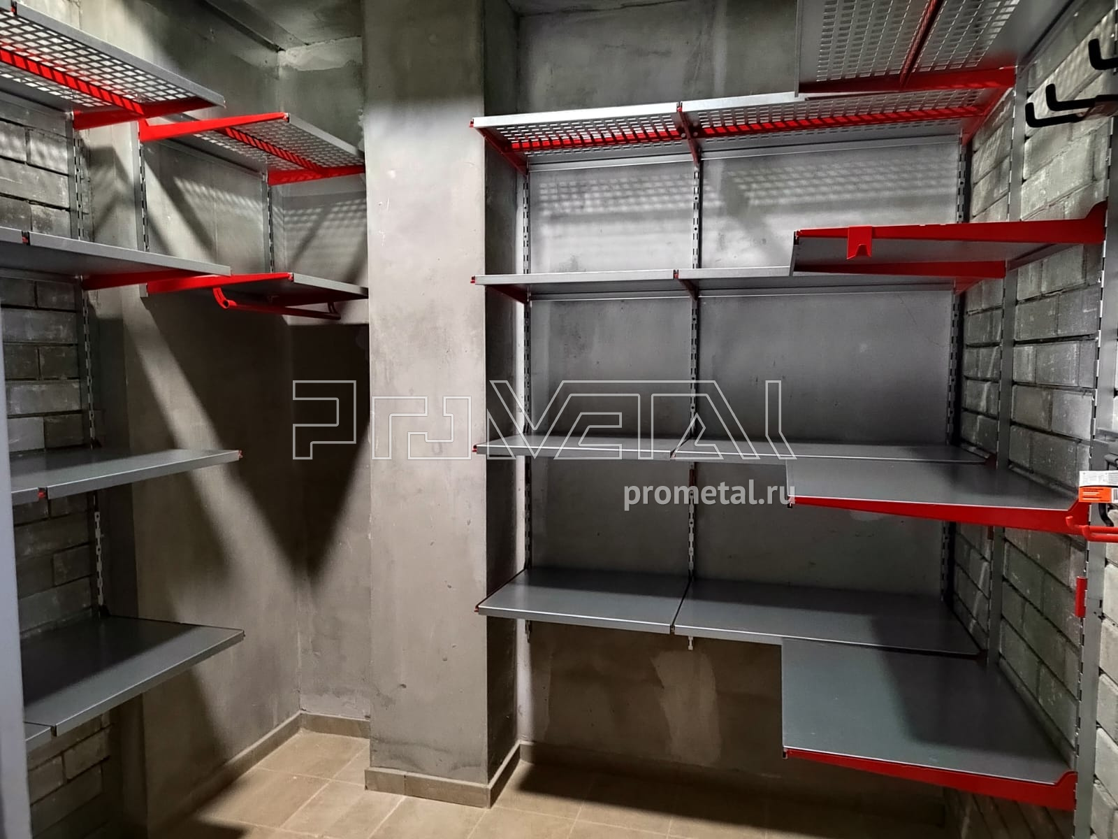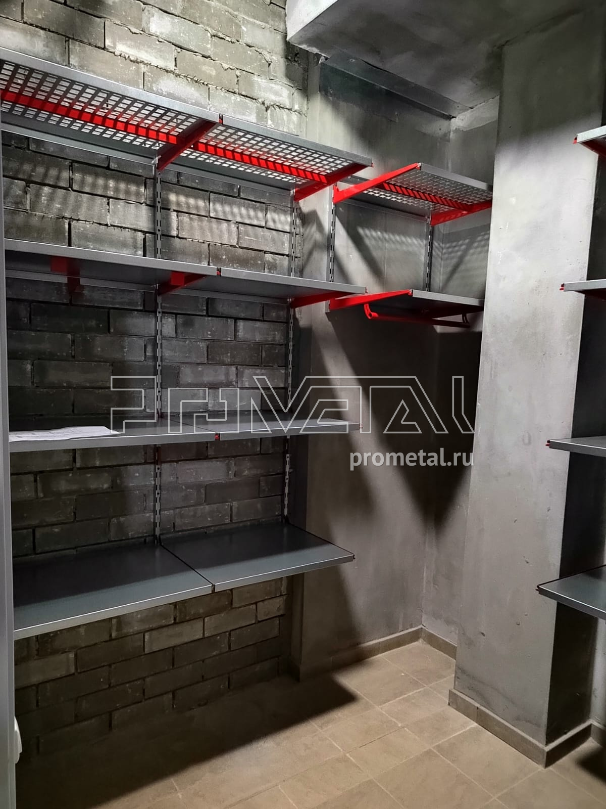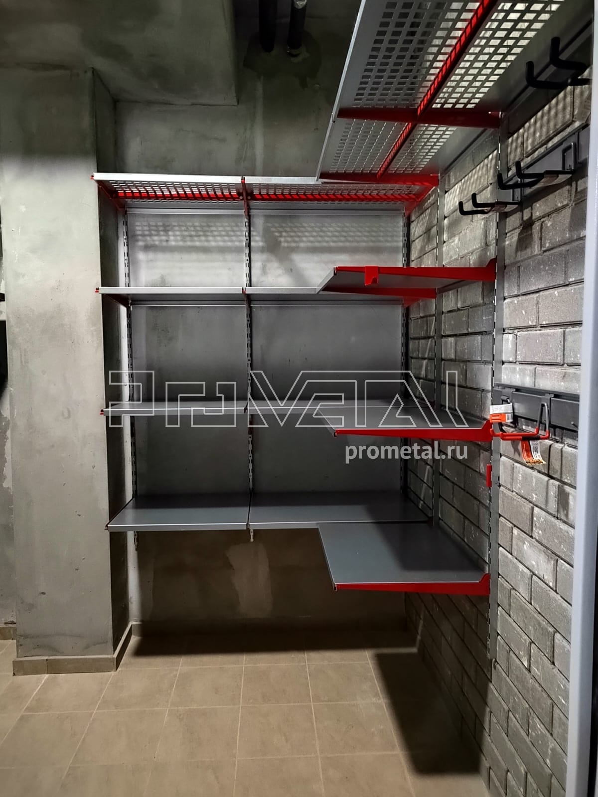 В проекте из полок были задействованы только глубокие 520мм. Верхний ряд выполнен полками с перфорацией, усиленными рёбрами жёсткости, такие мы устанавливаем выше человеческого роста, т.к снизу видно, что на них лежит и они частично пропускают свет. Все нижние ряды - цельные. В дальнем углу установили штангу для плечиков, под хранение сезонной одежды. На входе, справа, расположили два рейлинга для крюков Эссе, под различный инвентарь. В проекте имеются крюки на полку.