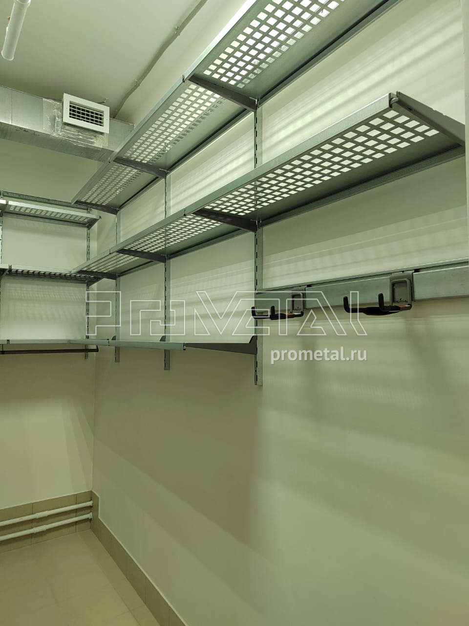 В проект основная площадь стен оборудована полками 520 и 315мм. Верхние 2 ряда выполнены полками с перфорацией. Они частично пропускают свет, меньше копят пыль и снизу можно посмотреть, что на них лежит. Все перфорированные полки 520мм усилены рёбрами жёсткости, что лишает их возможности прогибаться под большим весом. Нижние ряды полок - цельные. В проекте предусмотрена штанга под плечики, для хранения сезонной одежды. На входе, справа, расположили рейлинг с крюками Эссе, под хранение различного инвентаря, в том числе стремянки. В проект добавлены крюки под полку.