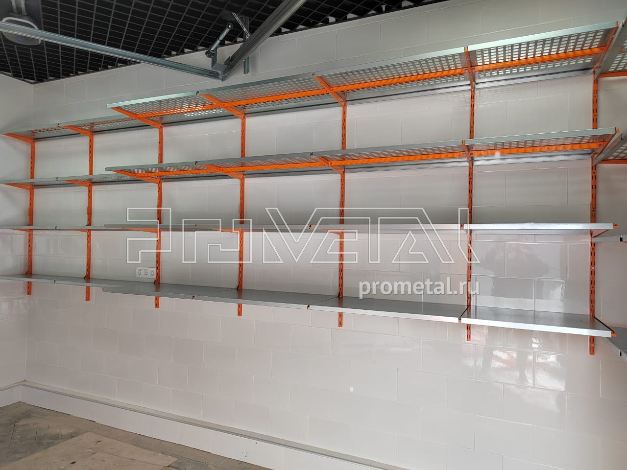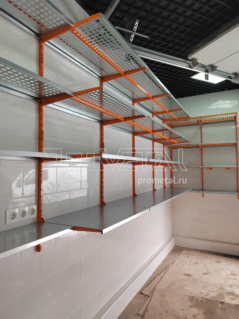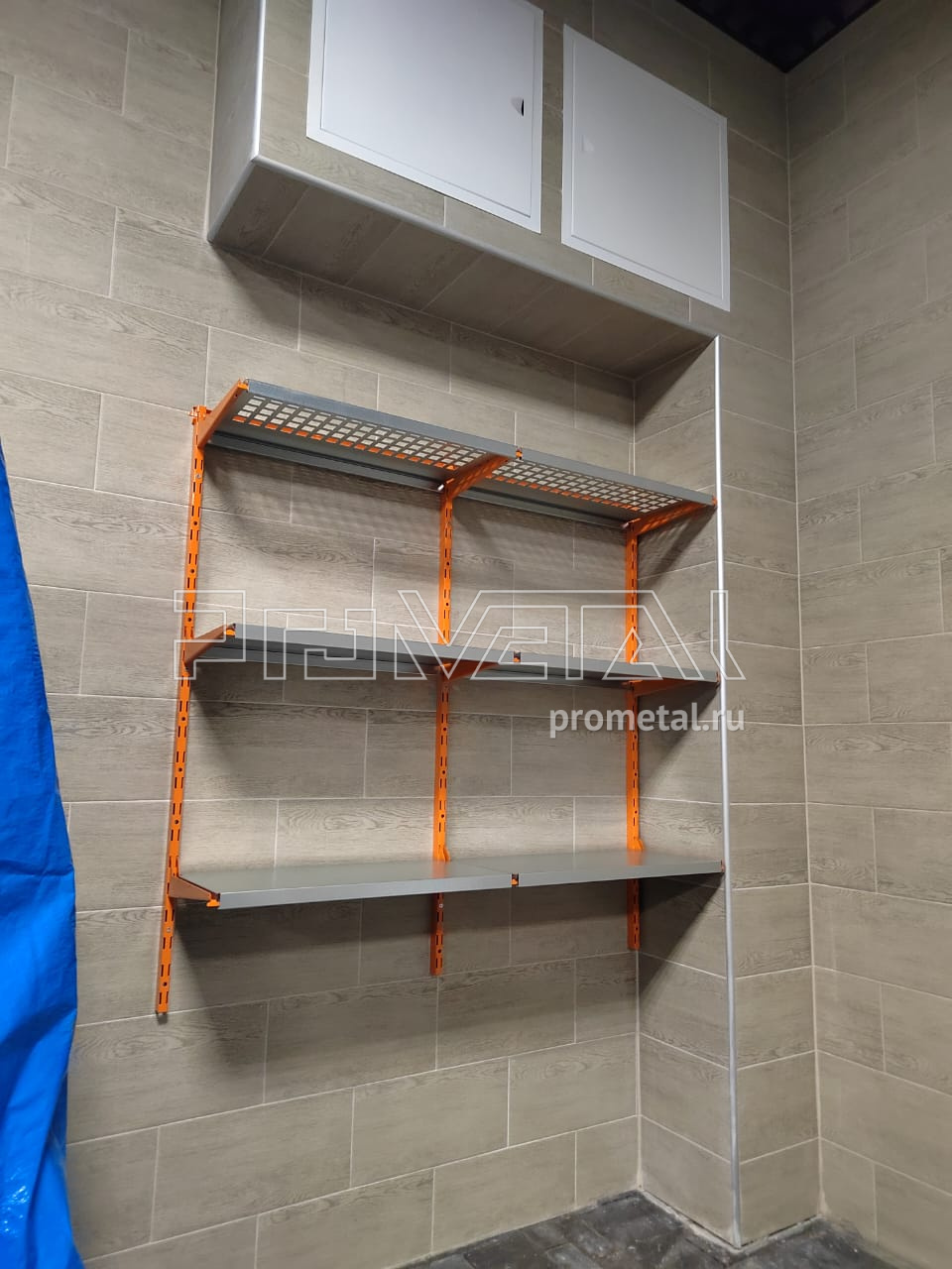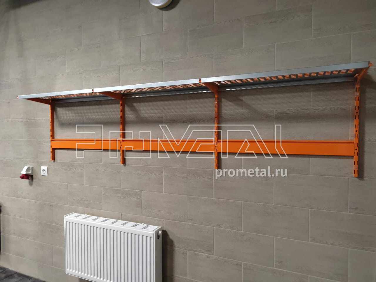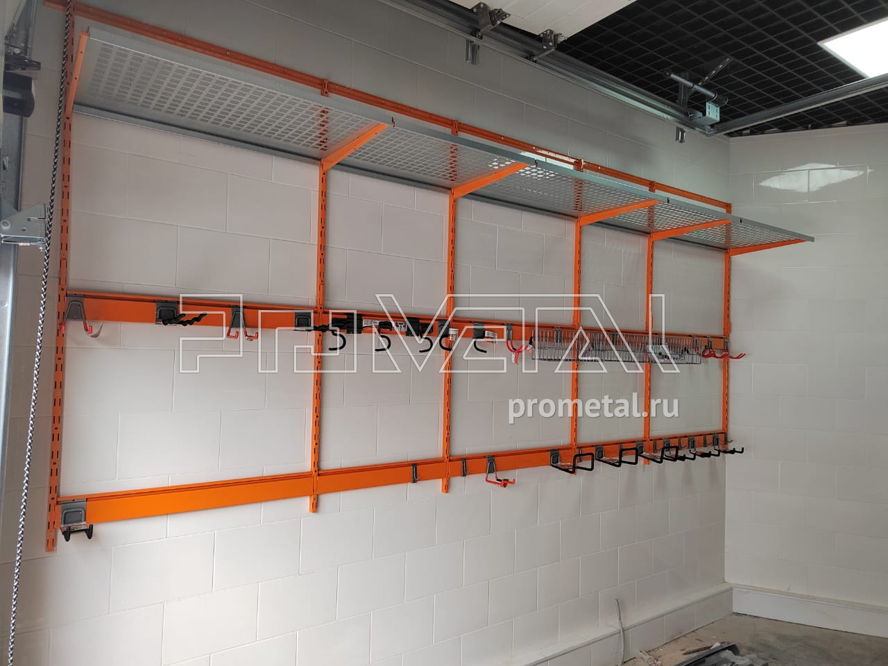 В проекте были задействованы перфорированные и цельные полки разной глубины. Перфорированные полки мы устанавливаем выше человеческого роста, т.к снизу видно, что на них лежит и они частично пропускают свет. Все перфорированные полки глубиной 520мм усилены рёбрами жёсткости. В проекте предусмотрено два ряда рейлингов во всю стену для крюков Эссе и стальных корзин, под садовый и хозяйственный инвентарь. В проекте добавлены крюки на полку.
