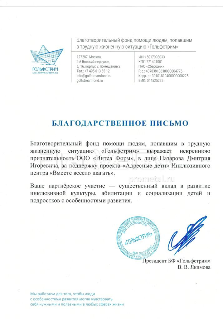 Все работы были осуществлены на благотворительной основе, за наш счет. Фонд "Гольфстрим" отправил нам Благодарственное письмо, мы были рады помочь детям!