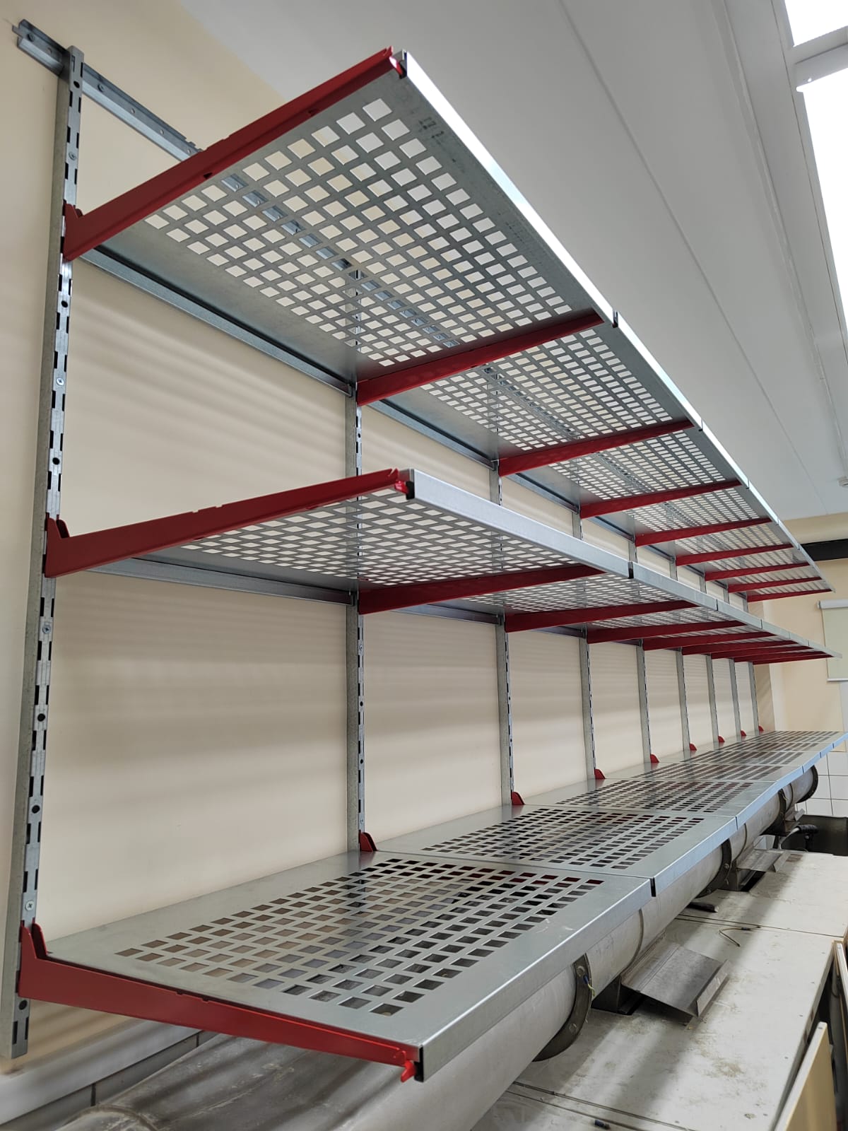 В проекте 3 ряда полок, задействованы только перфорированные полки глубиной 520мм. Такие полки отлично подходят для хранения коробок, пластиковых боксов. На фотографиях отлично видно как с помощью нашей системы можно оборудовать даже самые сложные помещения, напольные конструкции в данном проекте использовать было бы невозможно.