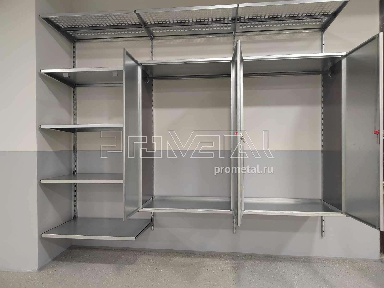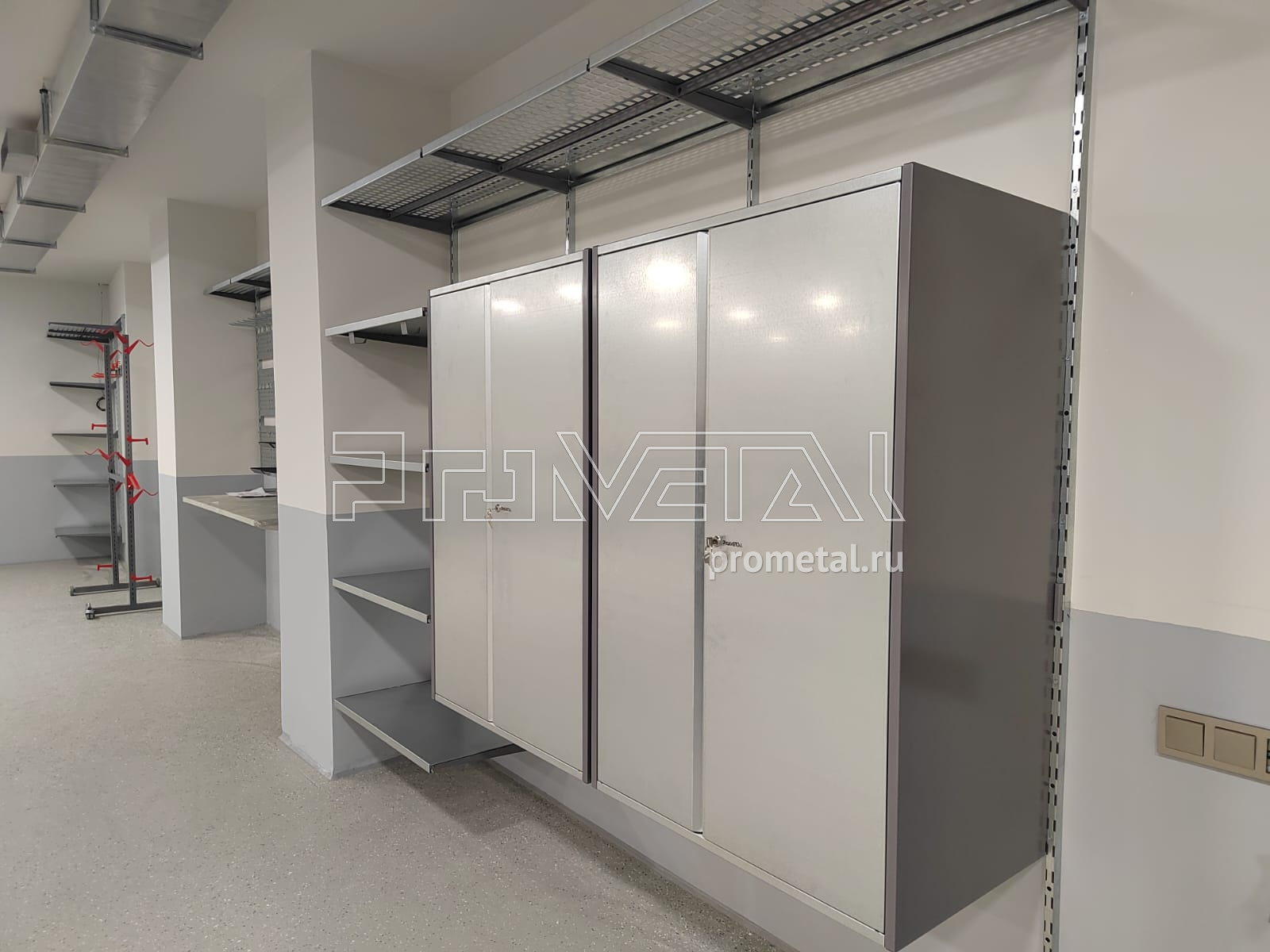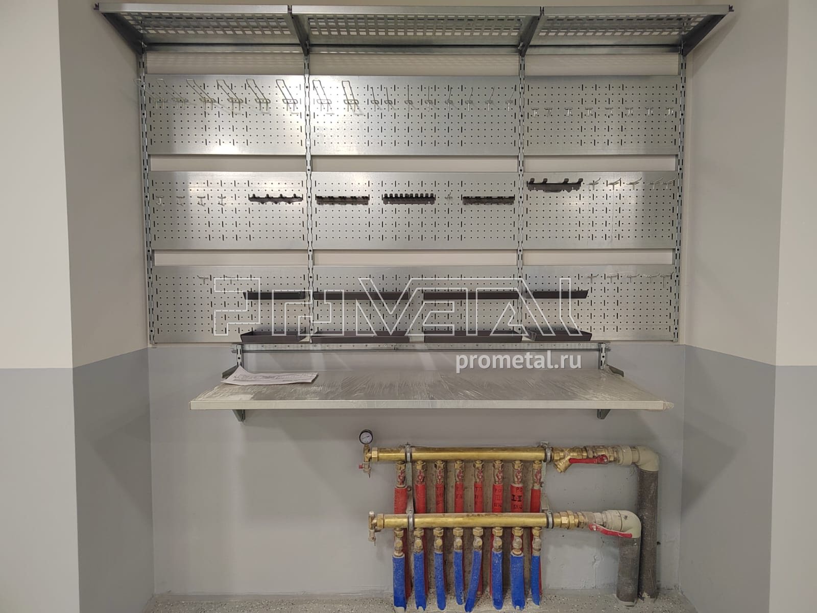 В проекте предусмотрена рабочая зона со складным столом-верстаком, над ним расположены перфопанели с крючками, лотками и держателями для инструментов. Правее рабочей зоны расположили два универсальных шкафа со штангами для плечиков, при необходимости, в шкаф можно установить полки глубиной 500мм. В левой части расположена универсальная стойка 4-Вело и рейлинг для хранения различного садового и хозяйственного инвентаря, на крюках Эссе. Остальное пространство оборудовано перфорированными и цельными полками глубиной 520мм. Все полки с перфорацией усилены рёбрами жёсткости.