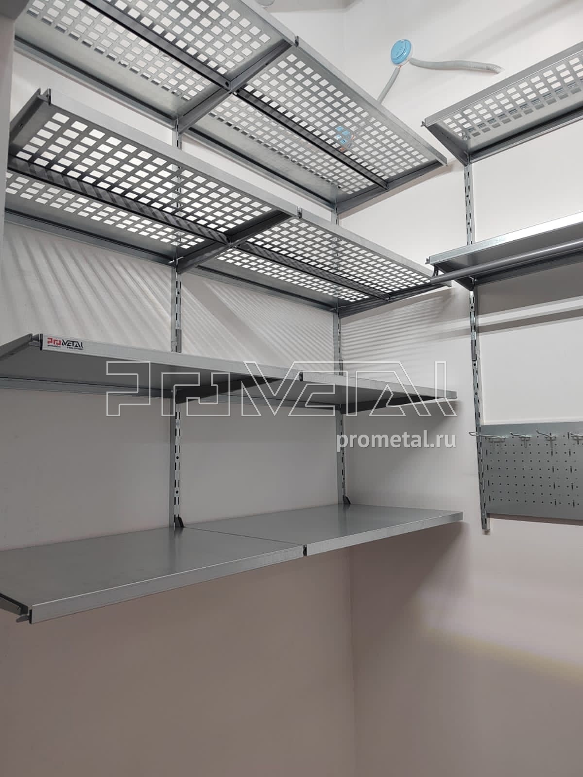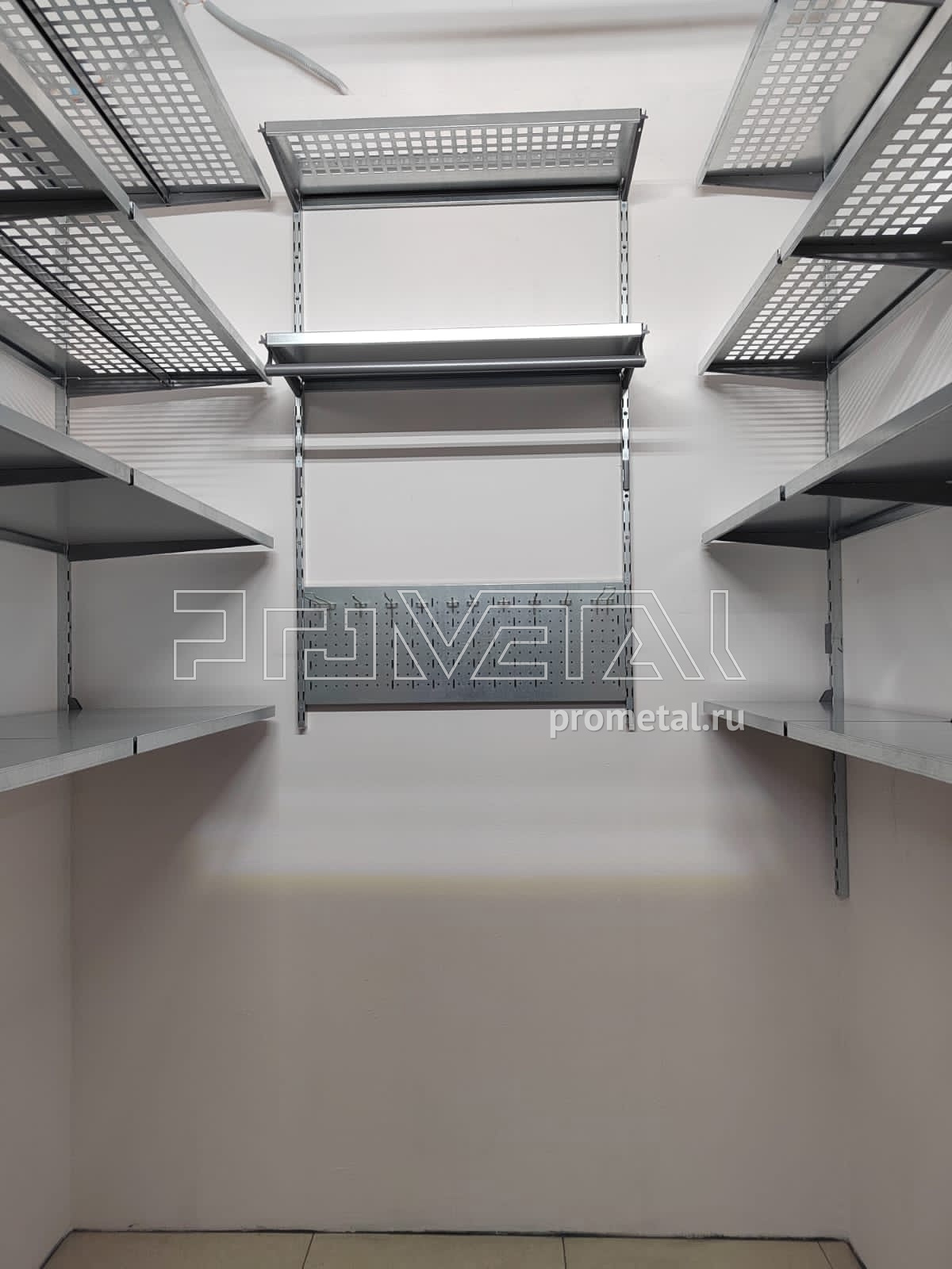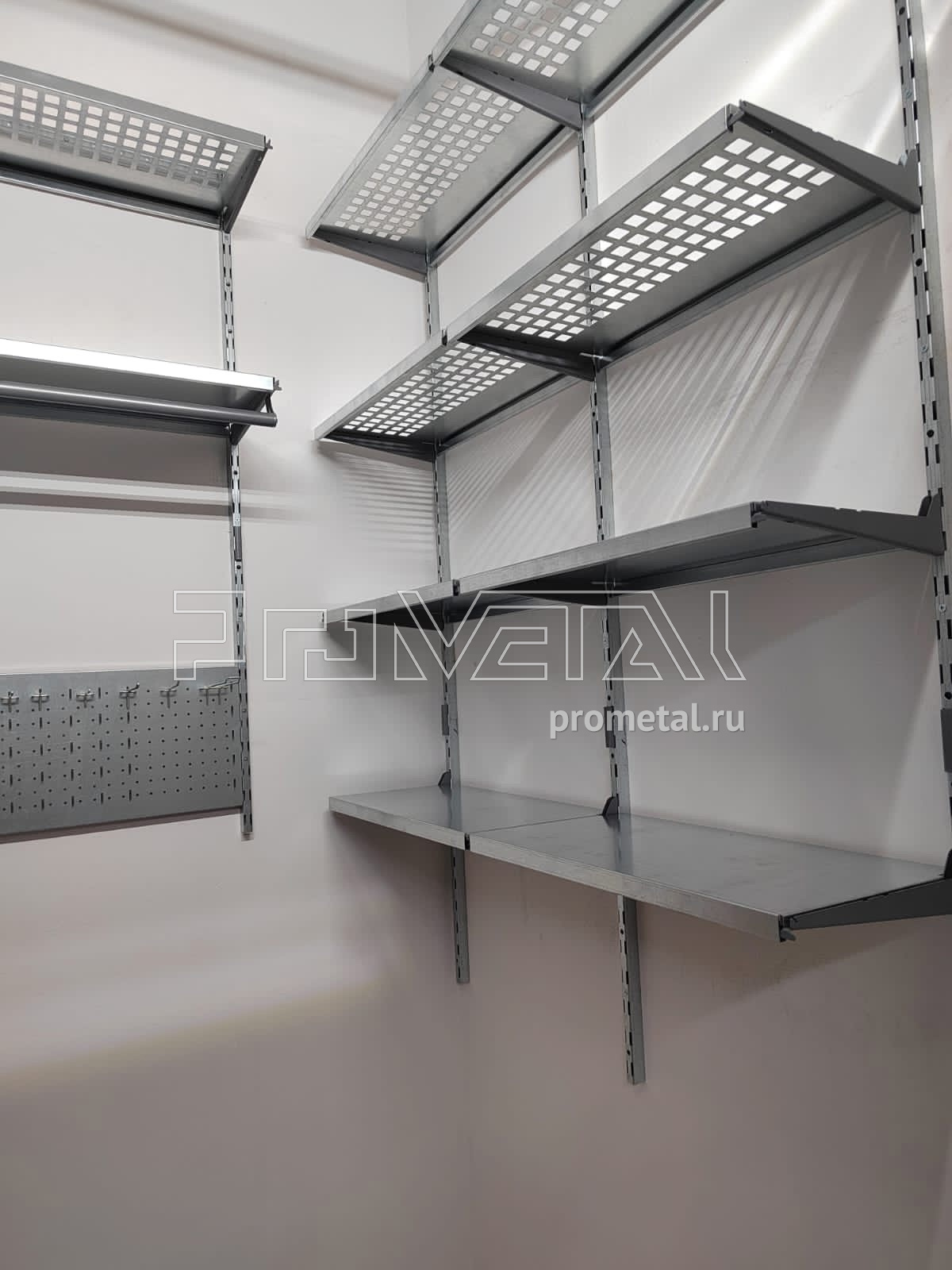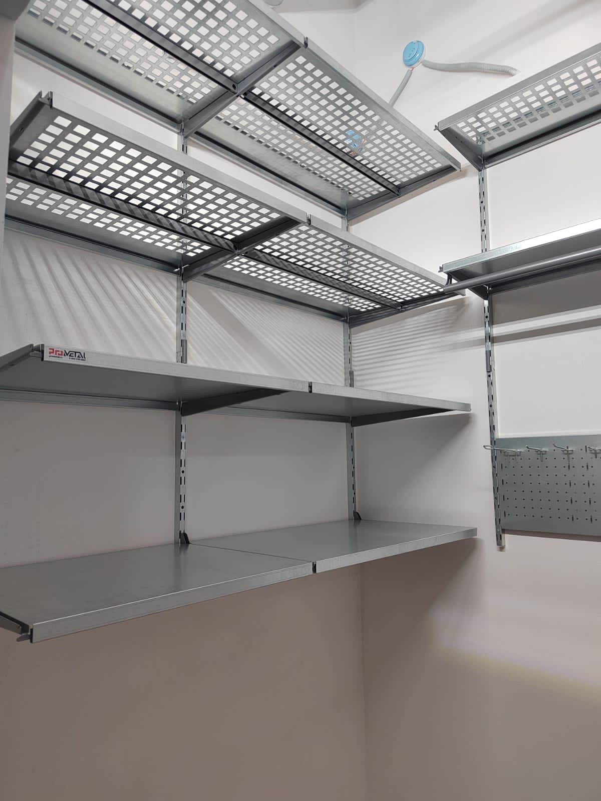 В проекте по левой стене установили цельные и перфорированные полки глубиной 520мм. Полки с перфорацией мы предусматриваем выше человеческого роста, т.к снизу видно, что на них лежит и они частично пропускают свет, не копят пыль. Все перфорированные полки глубиной 520мм усилены рёбрами жёсткости. На центральной и правой стене установили перфорированные и цельные полки глубиной 315мм, предусмотрена штанга для плечиков и перфопанель с крючками.