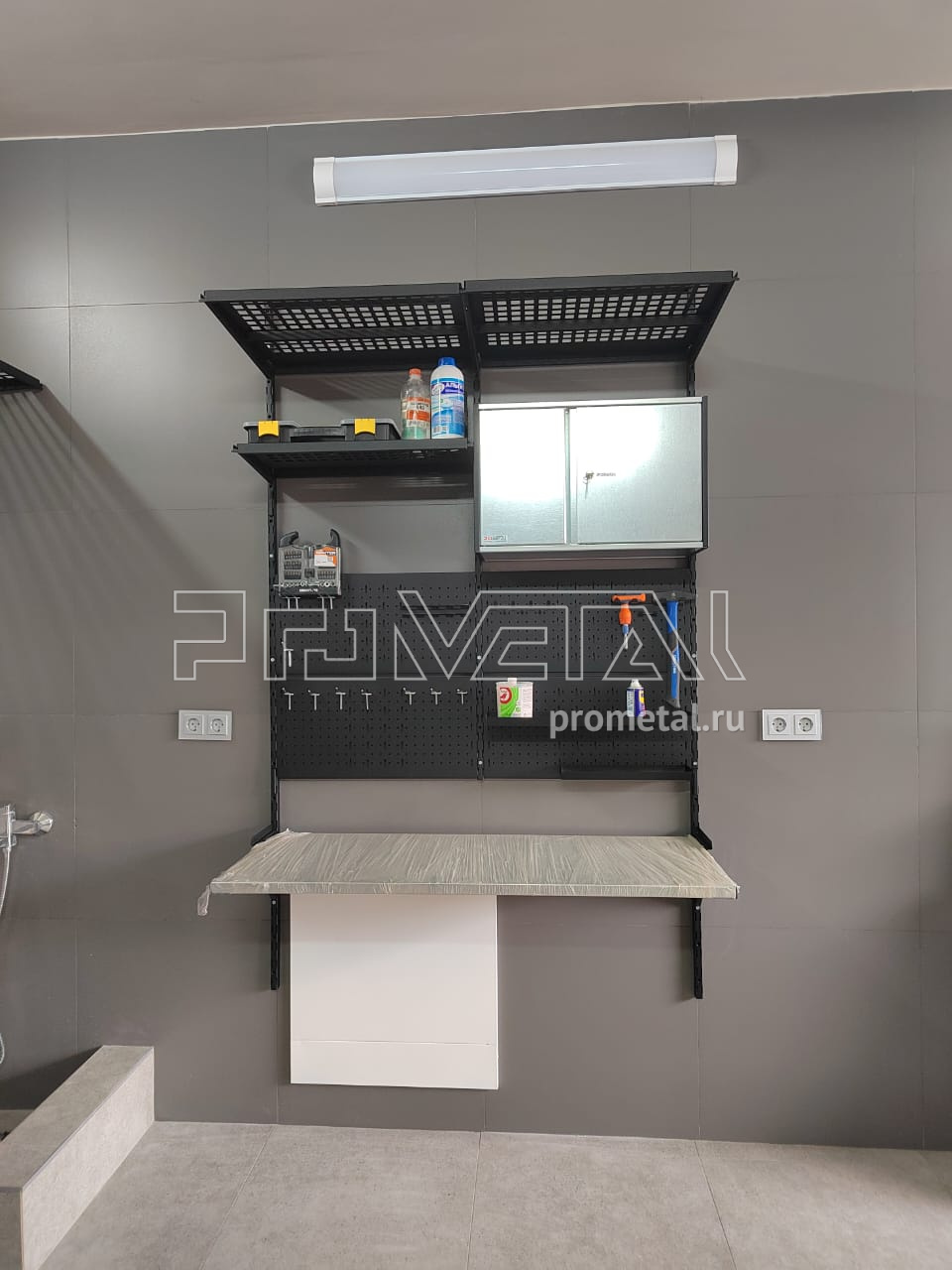 Верхние ряды полок - с перфорацией, нижние - цельные. Перфополки устанавливаем выше человеческого роста, они частично пропускают свет, снизу видно что на них хранится. В проекте предусмотрена рабочая зона со складным столом-верстаком, над верстаком предусмотрели перфопанели с крючками, лотками и держателями для инструментов. Чуть выше установили навесной шкафчик с замком. Задняя стенка шкафчика - перфорированная, можно использовать, аналогично перфопанелям. На левой стене разместили рейлинги с крюками Эссе, для хранения садового и хозяйственного инвентаря. Хранение велосипеда предусмотрено на модульном кронштейне.