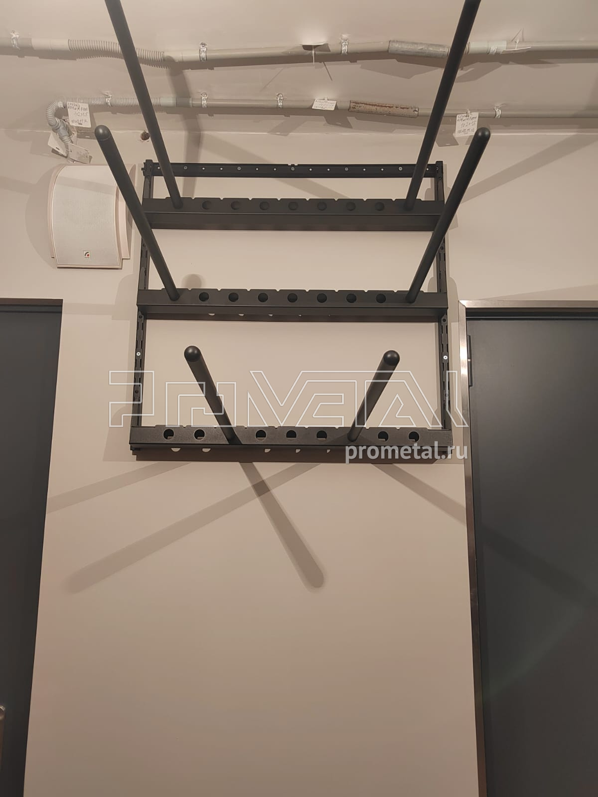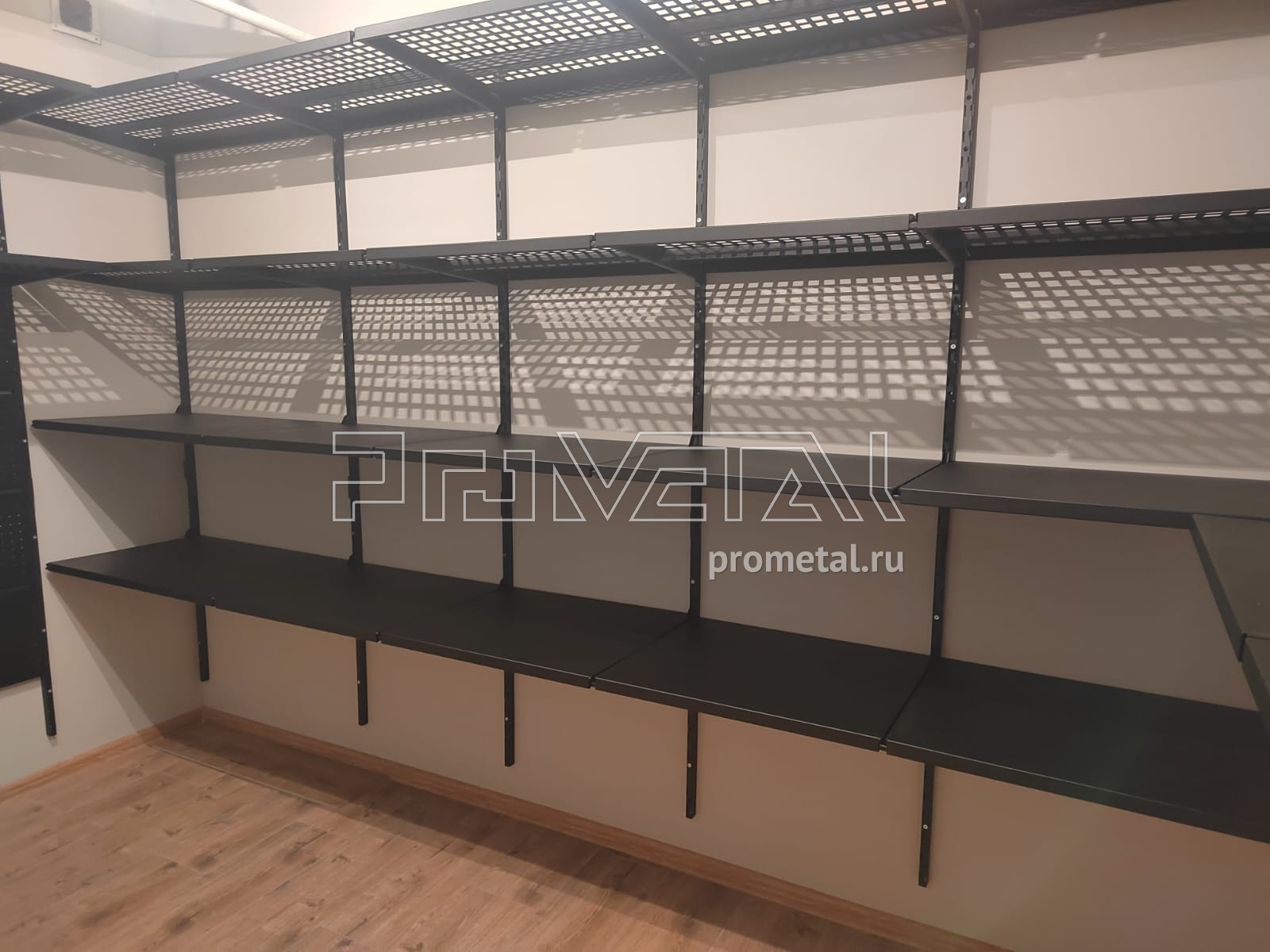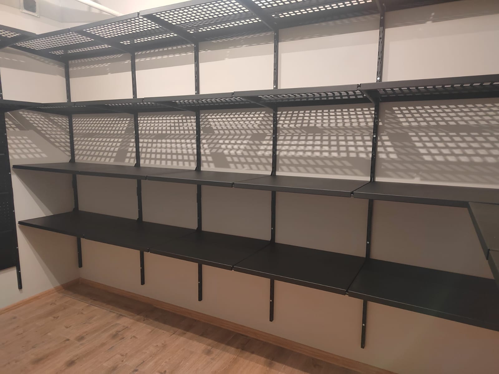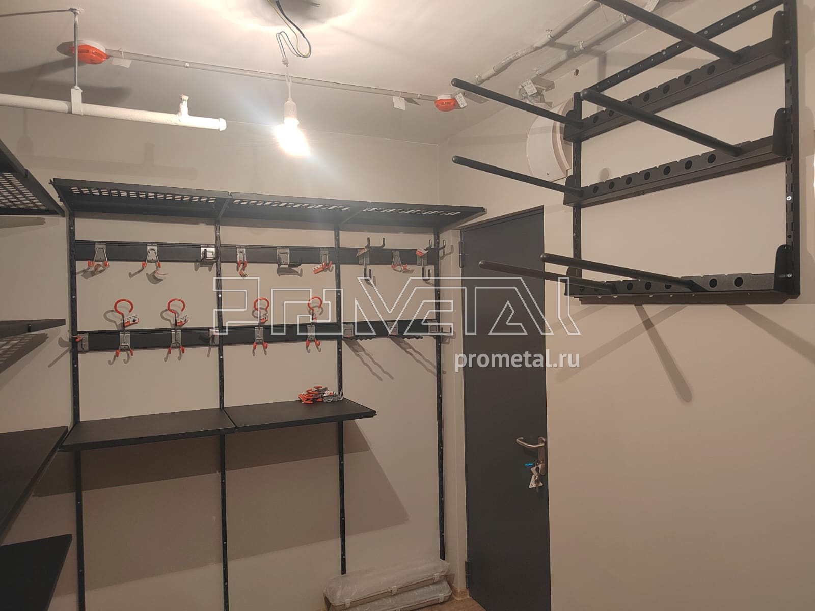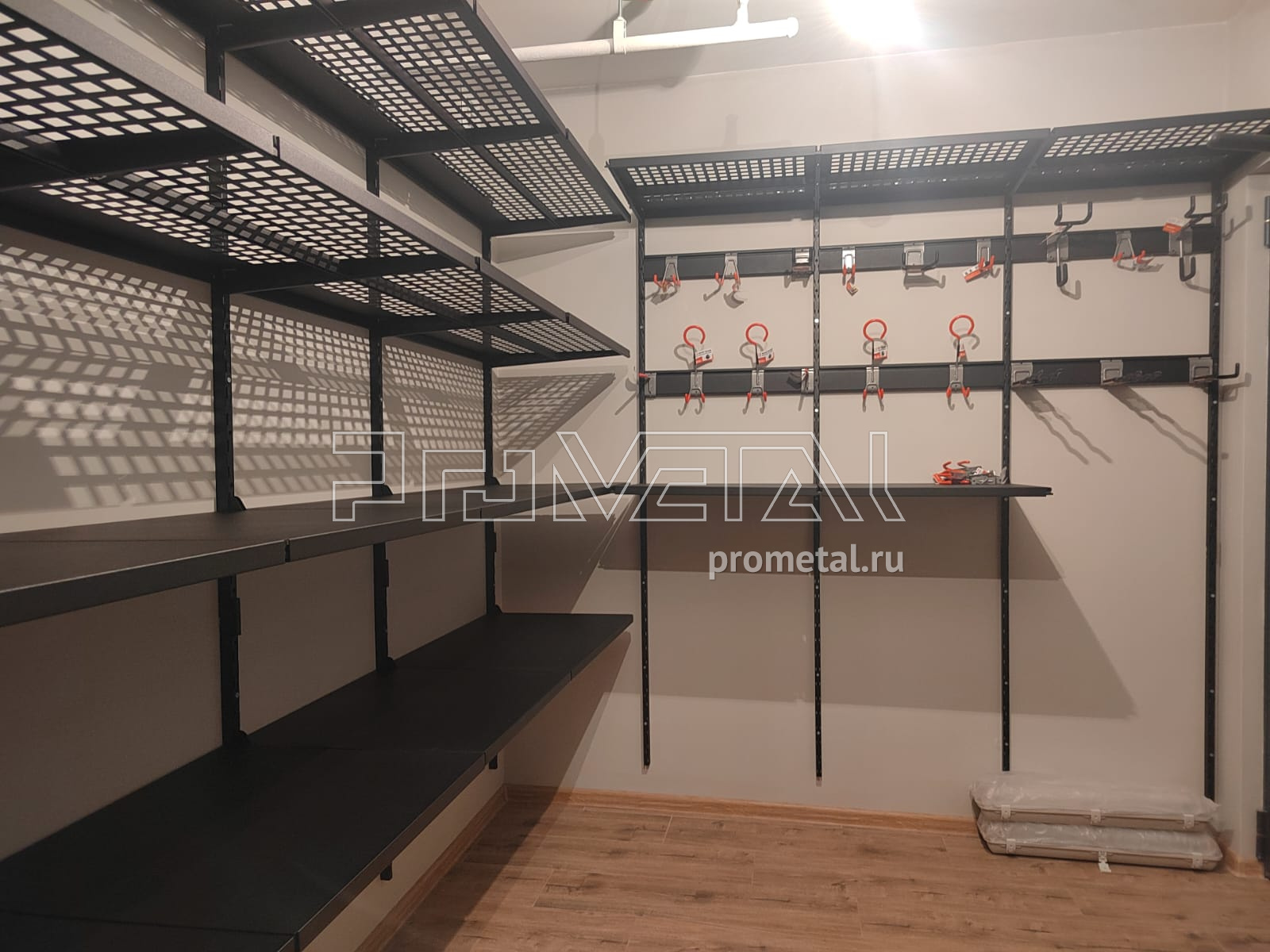 В проекте основная площадь стен оборудована перфорированными и цельными полками глубиной 520мм. Все полки с перфорацией усилены рёбрами жёсткости, дополнительно окрашены в черный цвет. Предусмотрено несколько рядов рейлингов, для хранения спортивного и хозяйственного инвентаря на крюках Эссе. На модулях-кронштейнах предусмотрено хранение велосипеда и вейкбордов.
