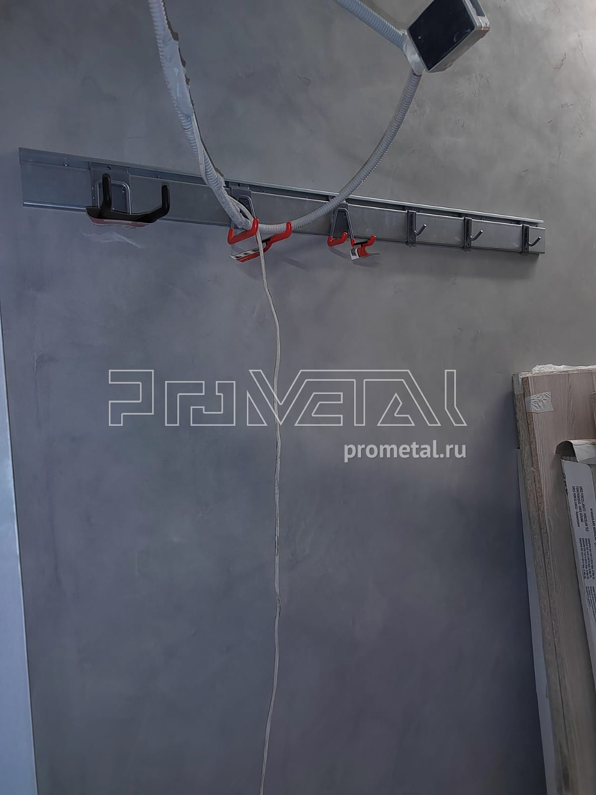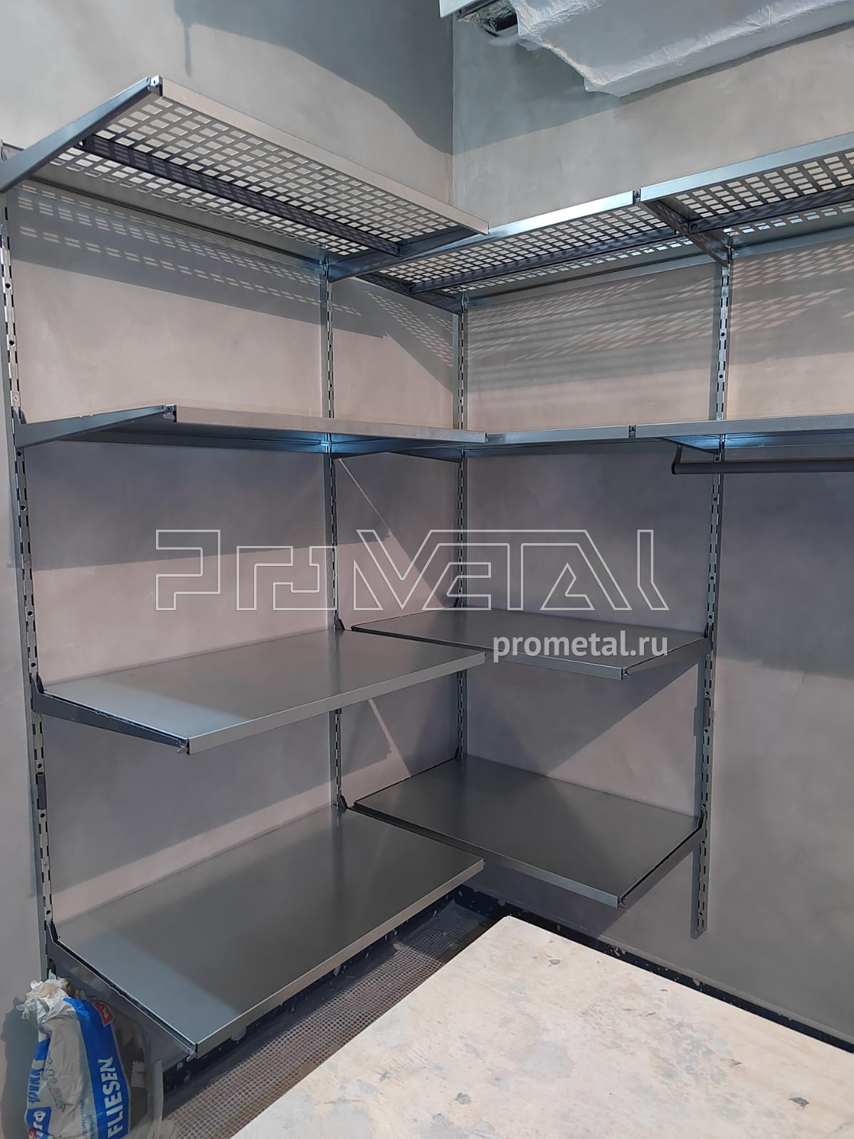 В проекте большая кладовая. Основная площадь стен оборудована цельными и перфорированными полками глубиной 520мм. Полки с перфорацией установлены выше человеческого роста, они частично пропускаю свет, не копят пыль и снизу видно что на них хранится, все перфополки усилены рёбрами жёсткости. Предусмотрена составная штанга, для хранения сезонной одежды на плечиках. Слева при входе установлен рейлинг для хранения стремянки и прочего хозяйственного инвентаря, на крюках Эссе. В проект добавлены крюки под полку.
