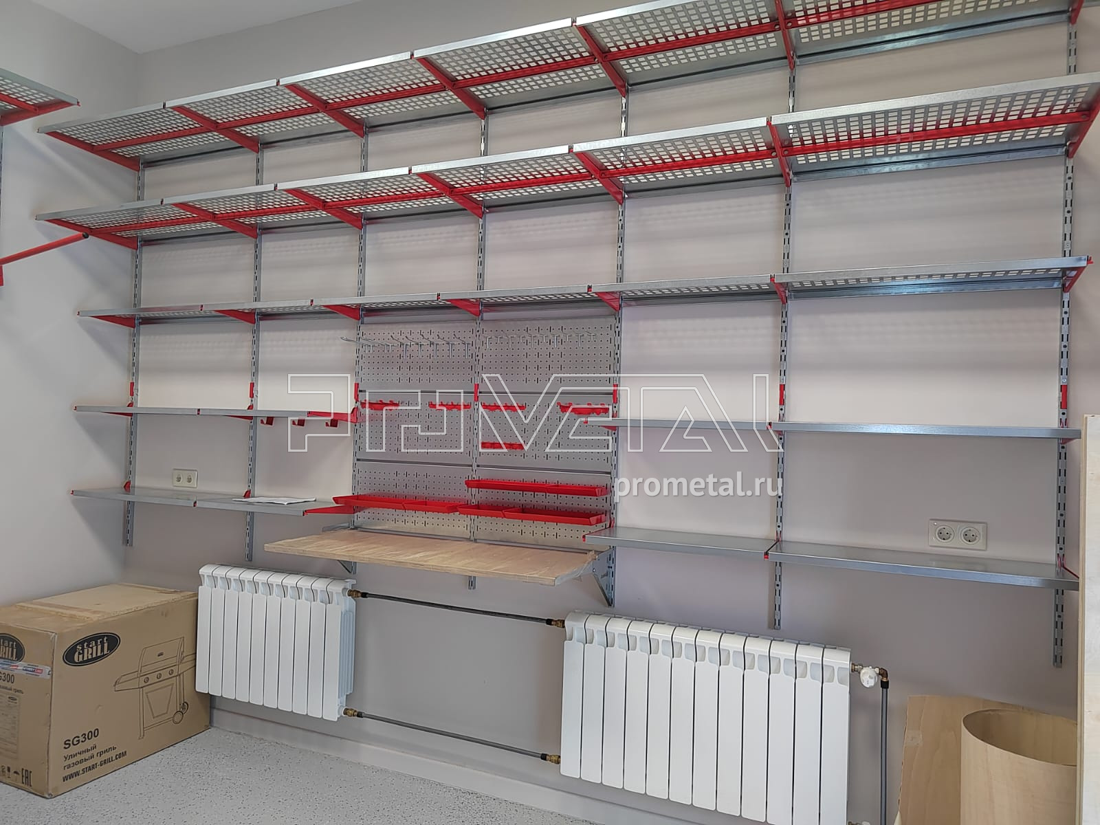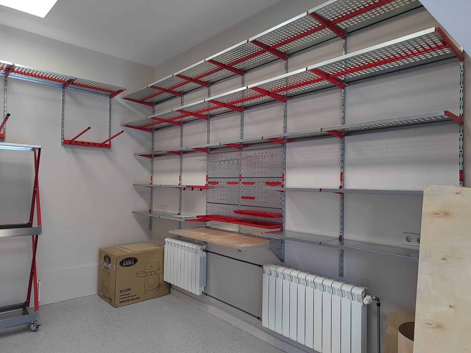 В гараже мы предусмотрели рабочую зону со складным столом-верстаком, для хранения инструментов над верстаком предусмотрены перфопанели с различными крючками, держателями инструментов. Мелочевку и крепеж храним в лоточках, они также крепятся на перфопанели. Основа любого проекта - полки. На полках заказчик будет хранить множество различных вещей: коробки, чемоданы, пластиковые боксы и т.д. Стеллажная система - модульная, в любой момент полки можно регулировать по высоте с шагом 50мм. В гараже заказчик попросил разместить 2 комплекта колес, для них мы предусмотрели семейный колесный стеллаж на роликах.