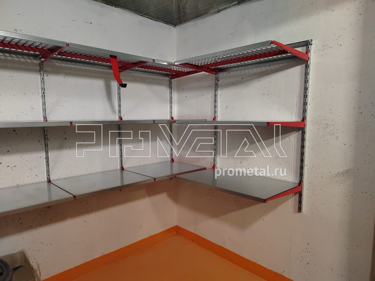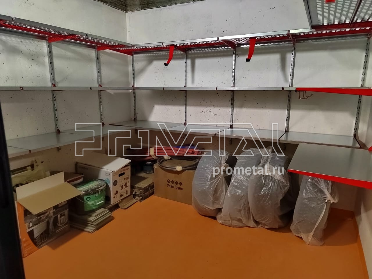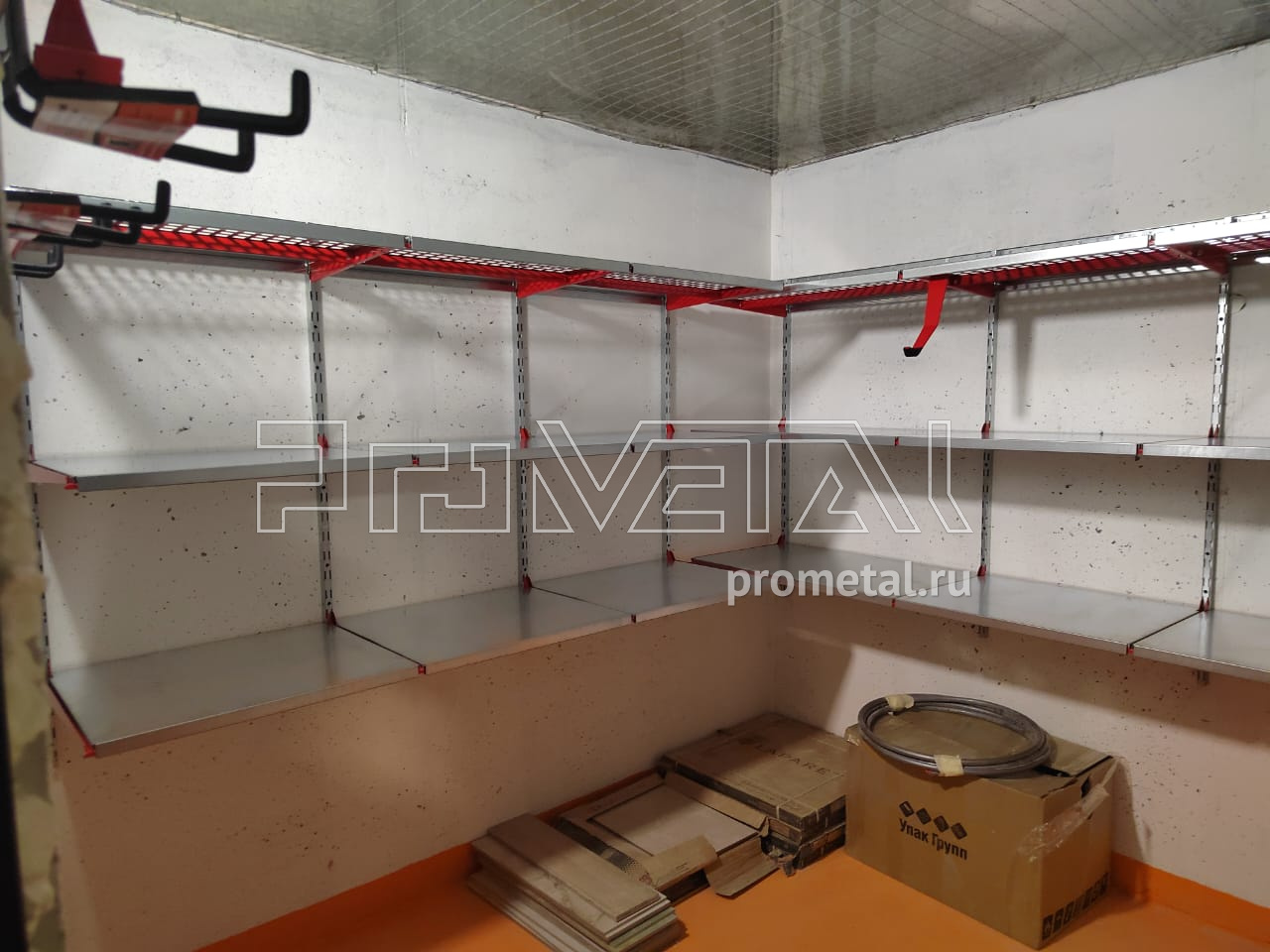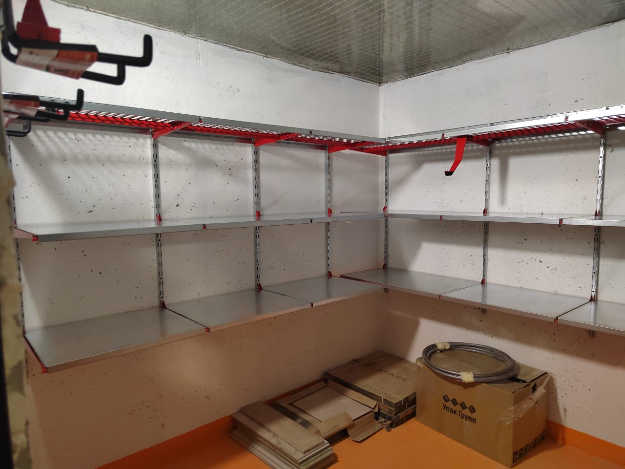 Высота потолков в помещении всего 2,4м, поэтому мы предусмотрели всего 3 ряда полок, комплект автомобильных колес храним на полу, под полками. Для велосипедов в проект добавили крюки для вело под полку. Слева при входу установили рейлинги с крюками Эссе для хранения различного хозяйственного инвентаря.