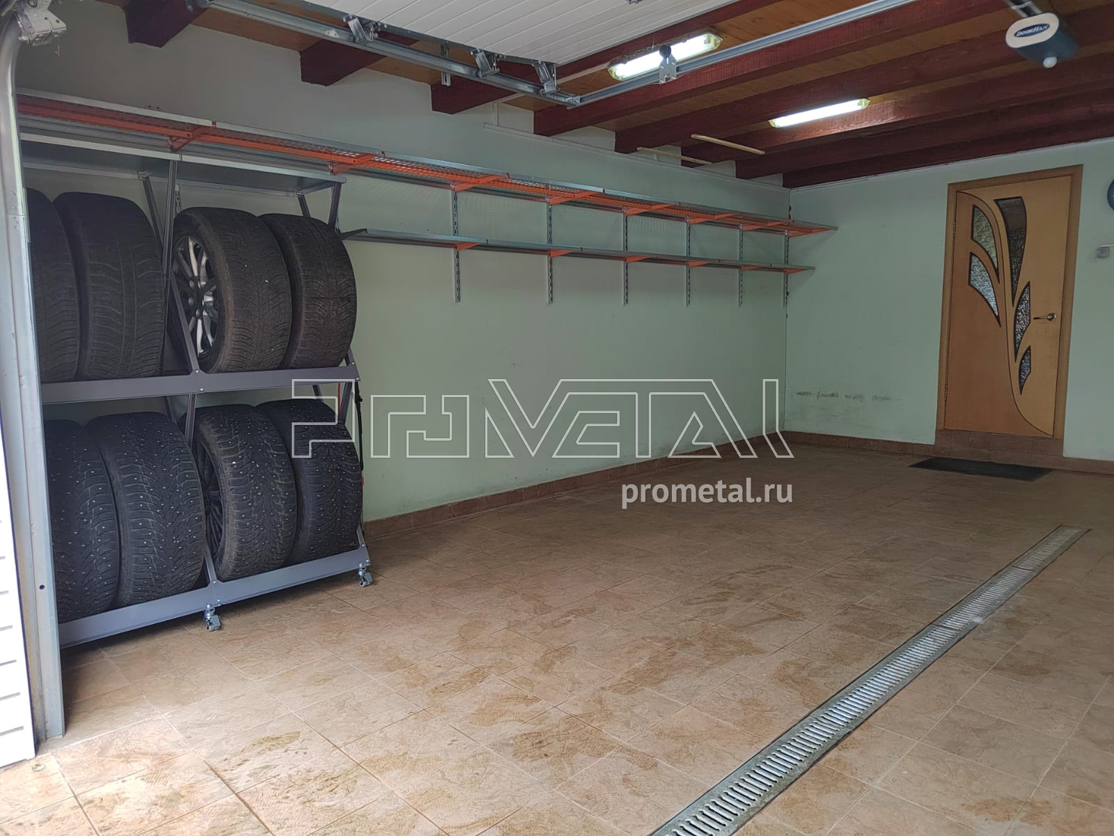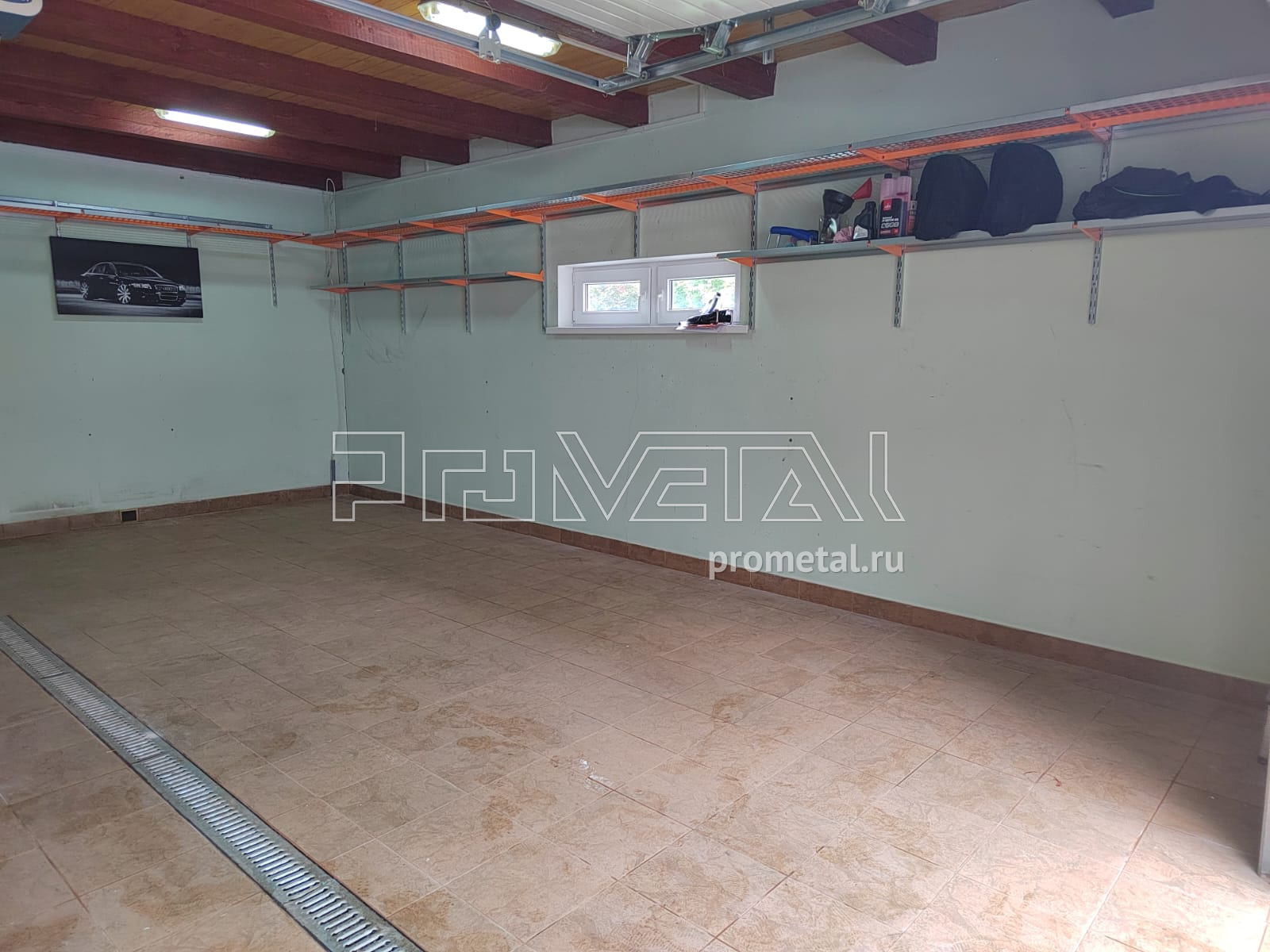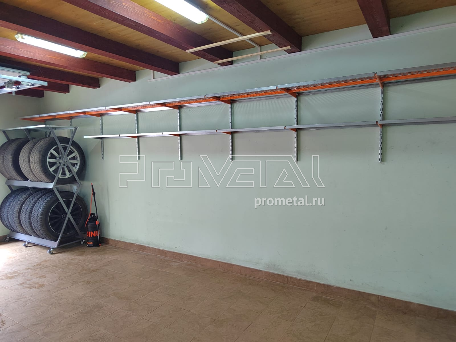 Небольшой гараж в Московской области, д. Акиньшино. Заказчик обратился с просьбой оборудовать гараж навесными полками, так чтоб не сужать помещение. Совместно с заказчиком приняли решение сделать полки по периметру гаража, выше человеческого роста.