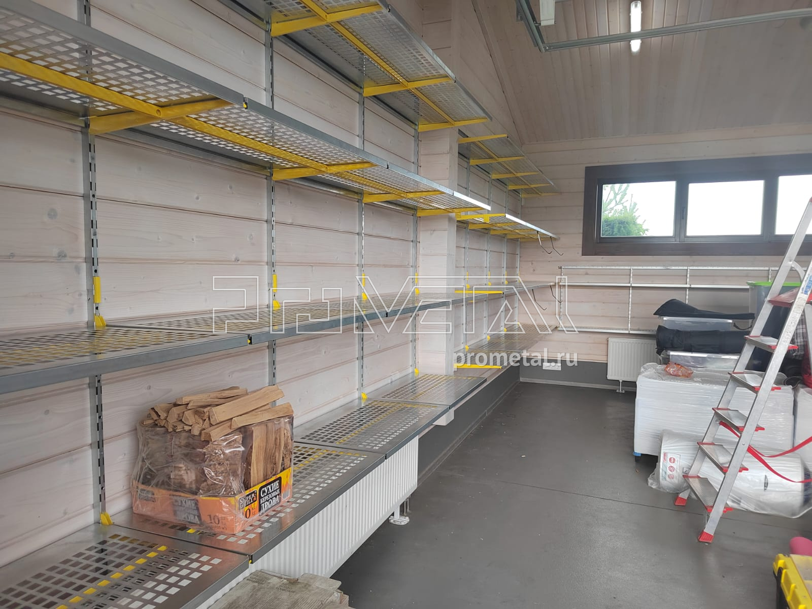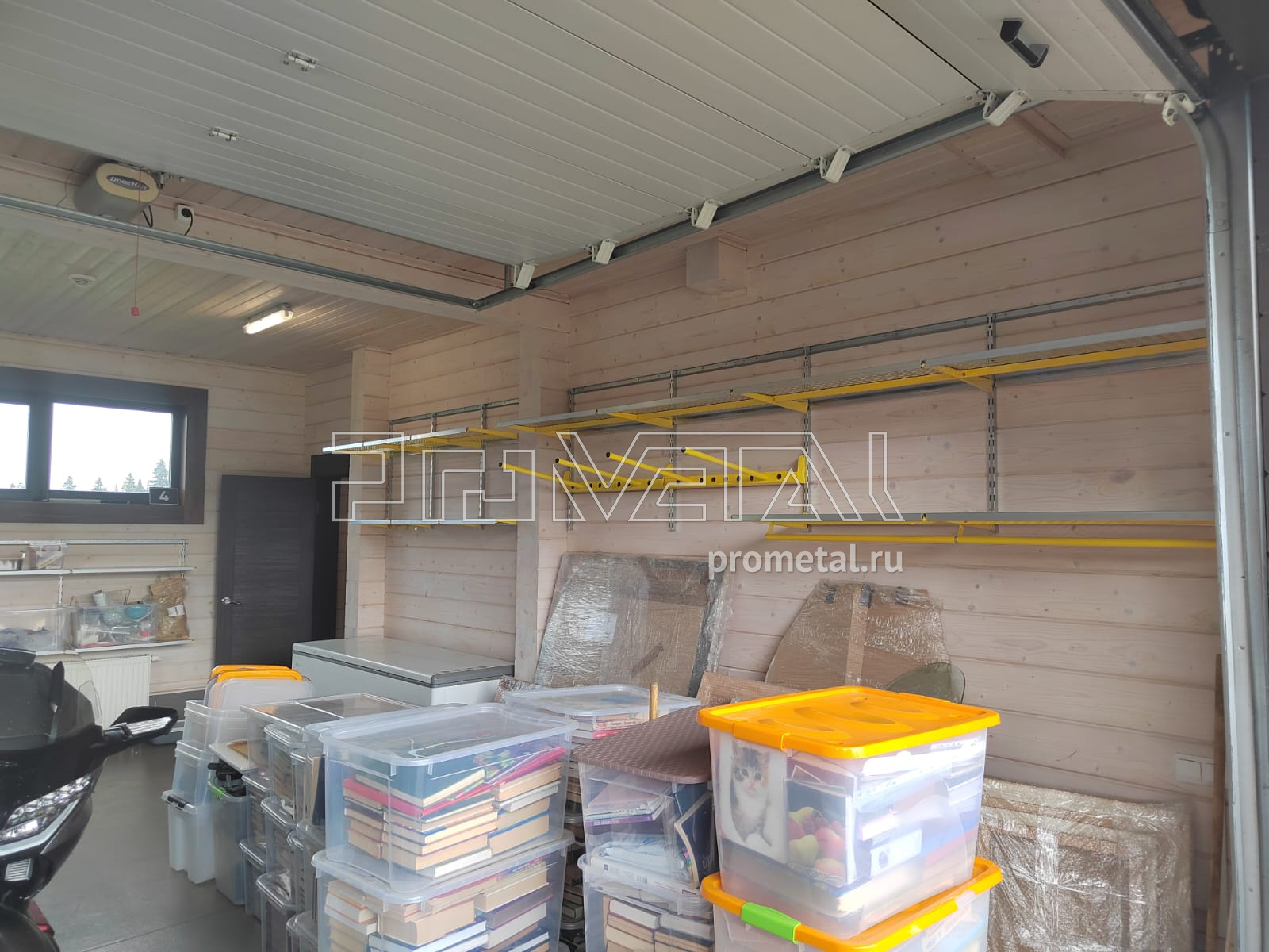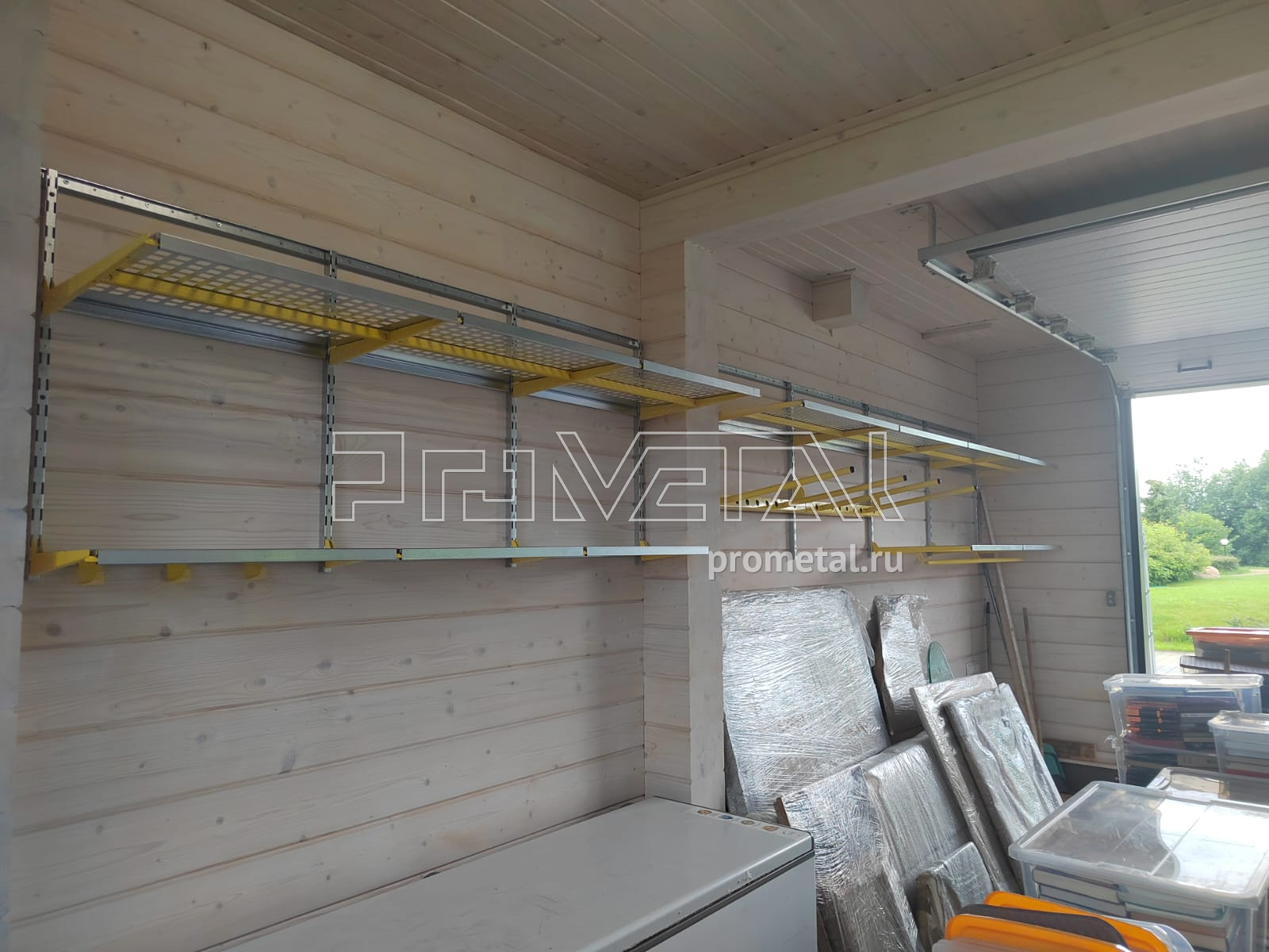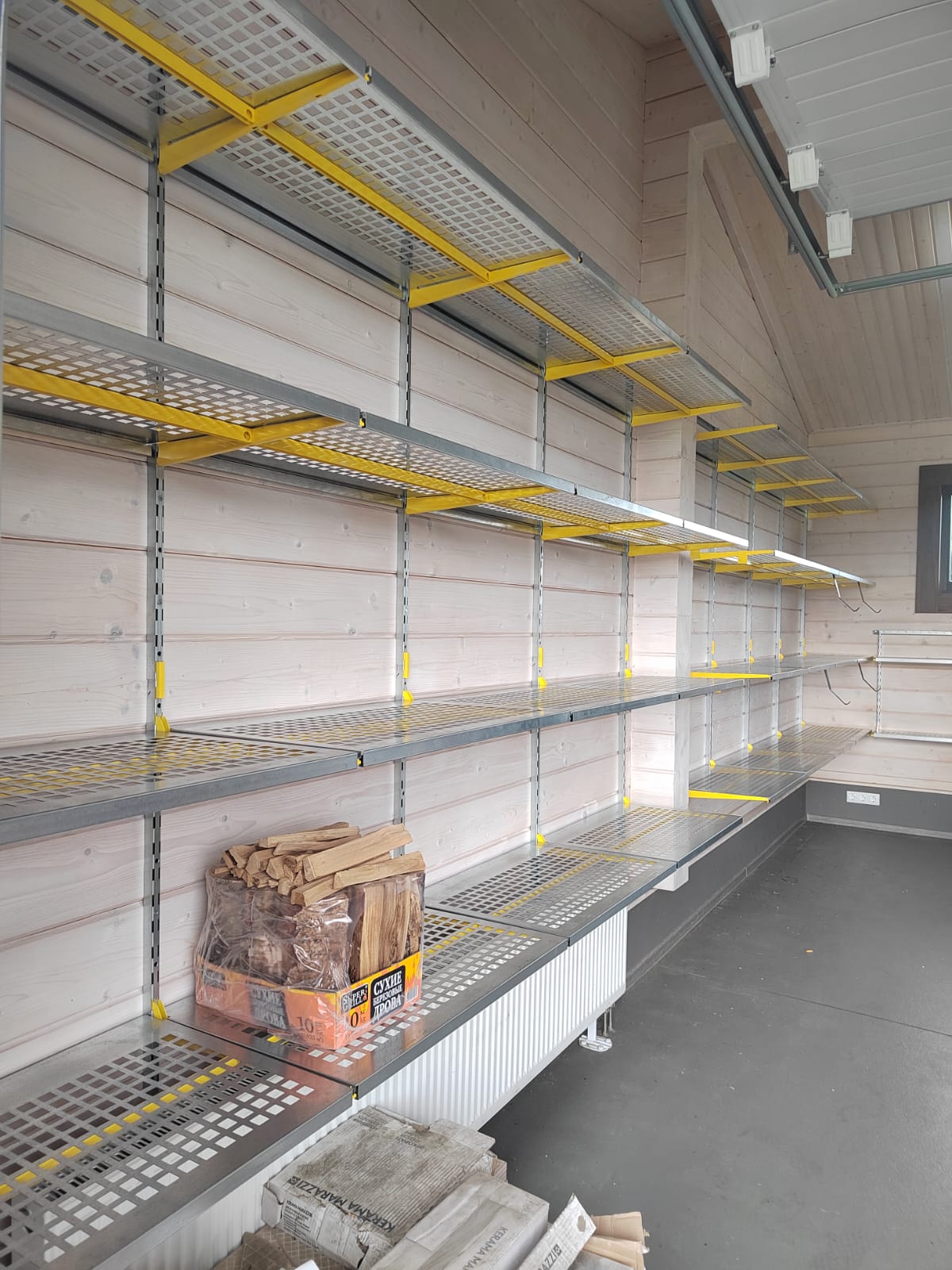 Достаточно большой гараж в КП "Мансурово Лайф". На такие объекты мы рекомендуем приглашать наших специалистов на замер, этот гараж не исключение, проект разрабатывался по размерам нашего замерщика. Цвет выбрали немного не стандартный - жёлтый. Задачи были поставлены достаточно стандартные: побольше полок для хранения всего, предусмотреть крюки под садовый инвентарь, место для хранения велосипедов, штанги под плечики для одежды.