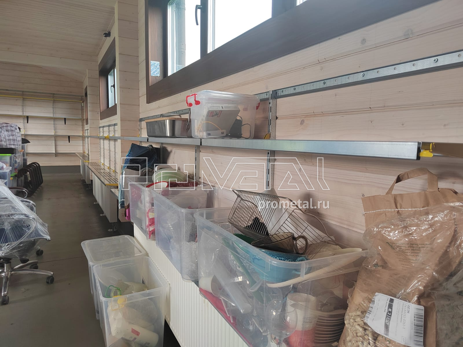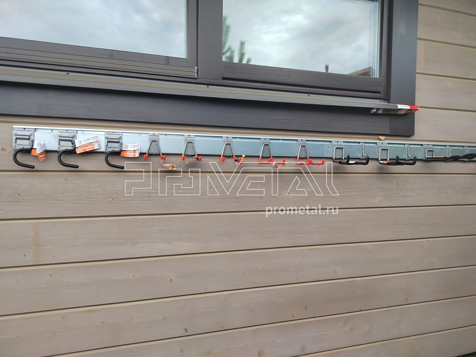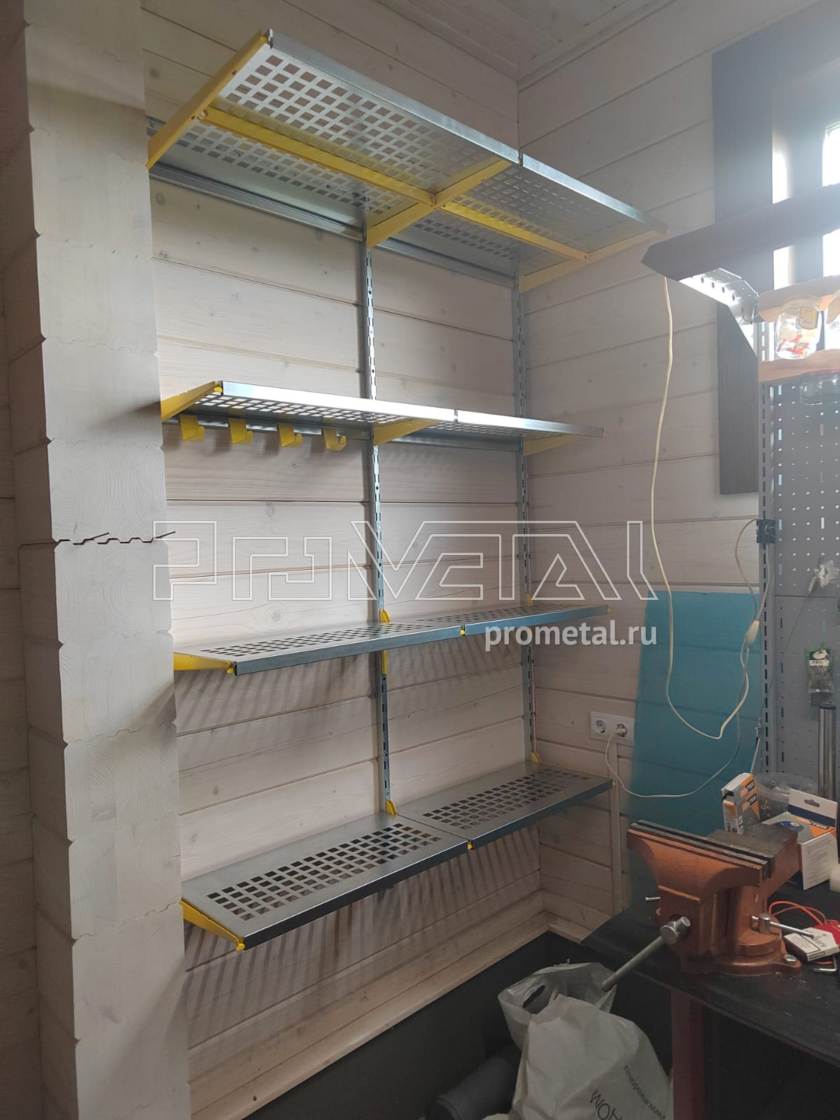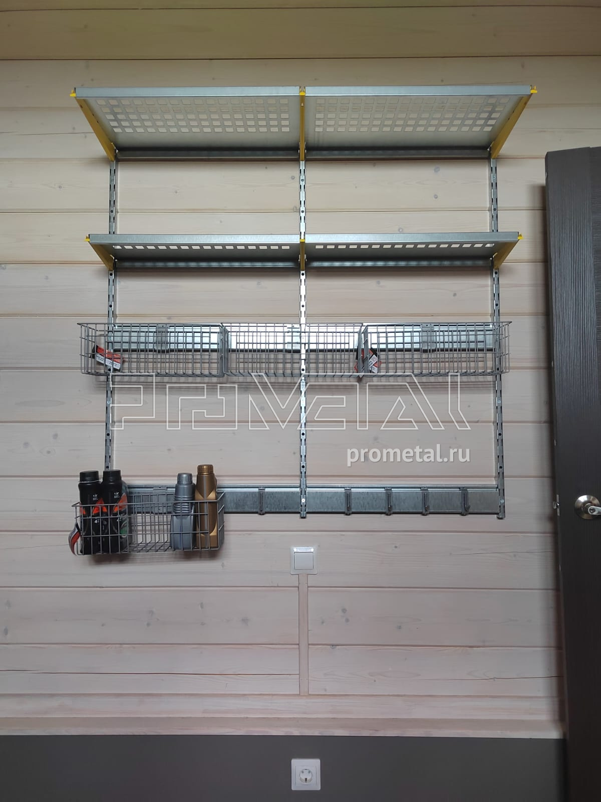 В проекте задействованы полки с перфорацией глубиной 315 и 520мм. Глубокие полки 520мм дополнительно усилены рёбрами жёсткости. Предусмотрена составная штанга для плечиков. Для хранения велосипедов использовали модули-кронштейны и крюки на полку для велосипеда. Под хранение хозяйственного и садового инвентаря, установили рейлинги с крюками Эссе и стальными корзинками. В проект добавлены крюки на полку.