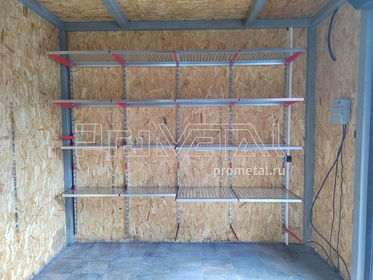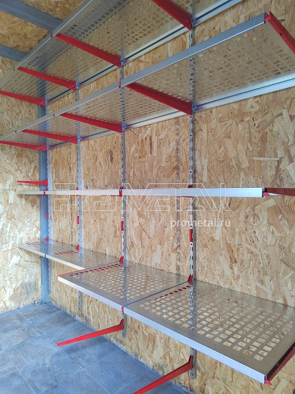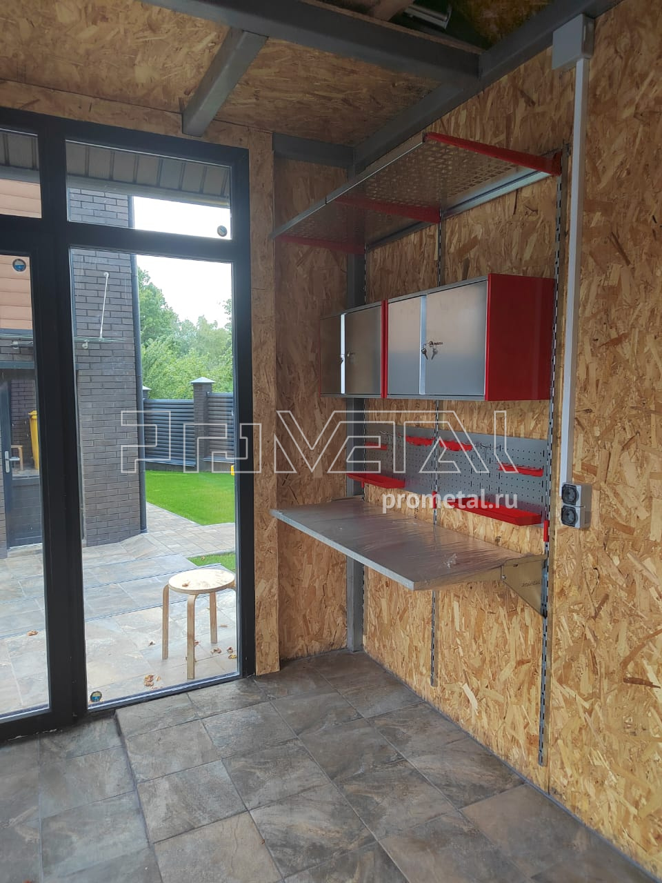 В основе проекта полки с перфорацией глубиной 315 и 520мм. Полки с перфорацией глубиной 520мм дополнительно усилены рёбрами жёсткости. Такие полки отлично подходят для хранения любых вещей. Предусмотрена рабочая зона со складным столом-верстаком, над рабочей поверхностью установили перфопанели с лотками, крючками и держателями инструментов. В рабочей зоне установили два навесных шкафчика с замком, задняя стенка шкафчика с перфорацией. В проекте добавлены крюки на полку.