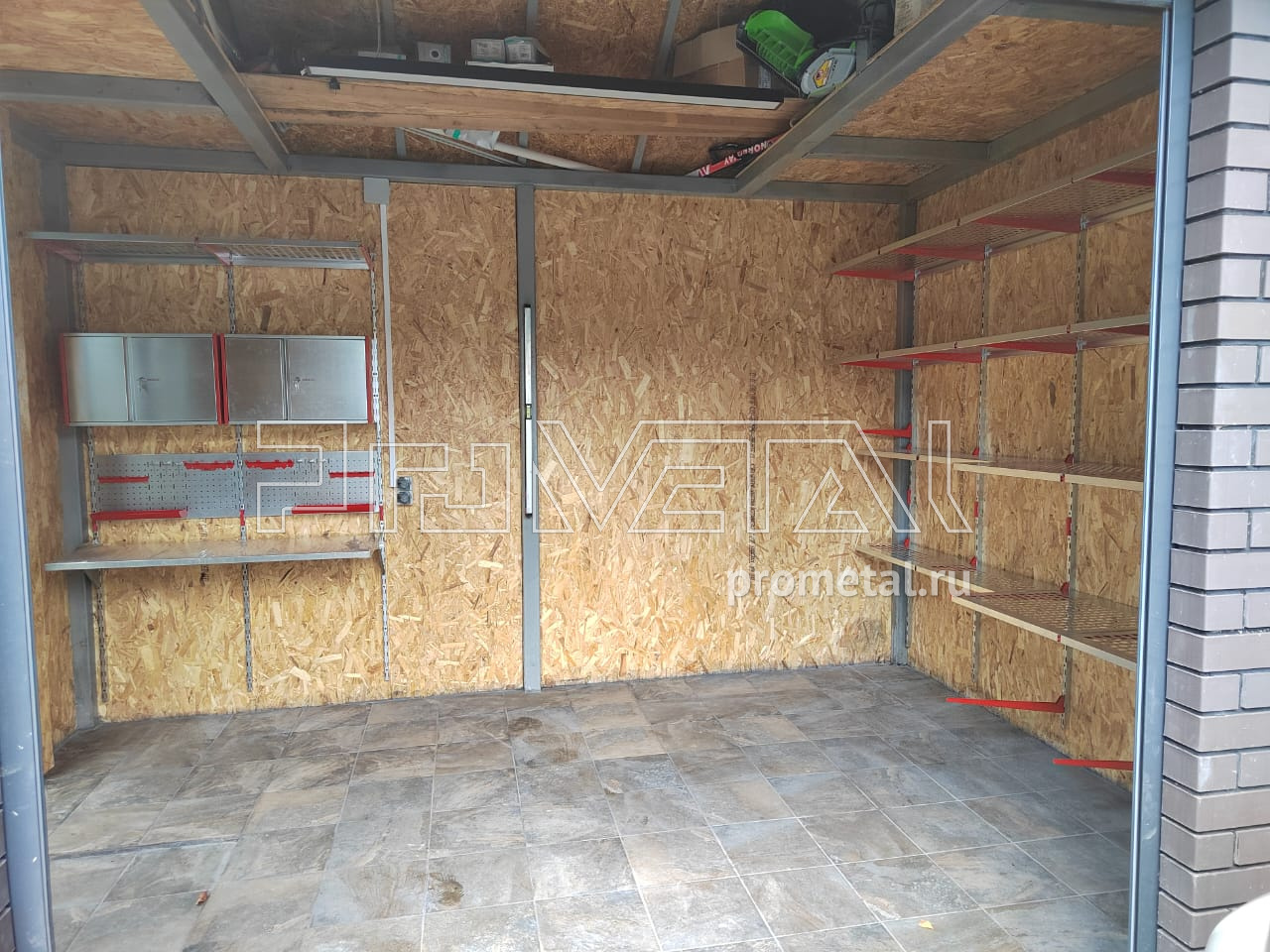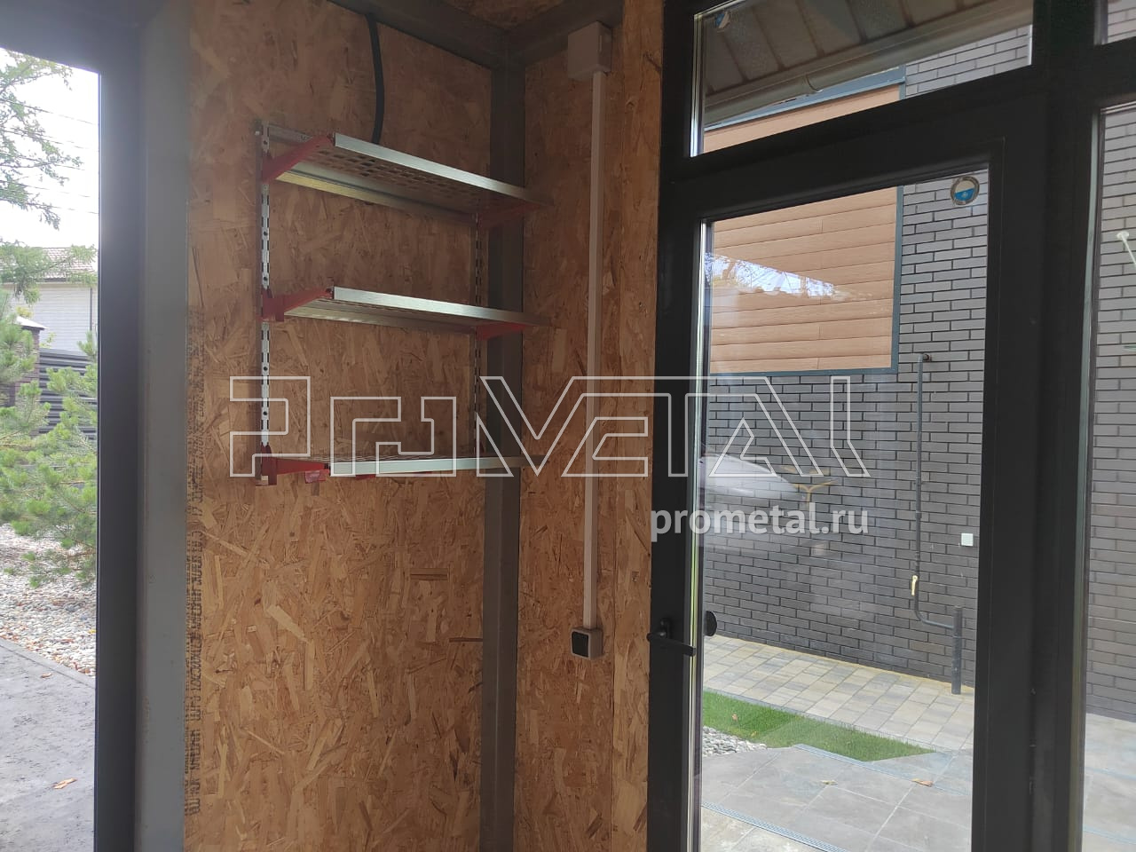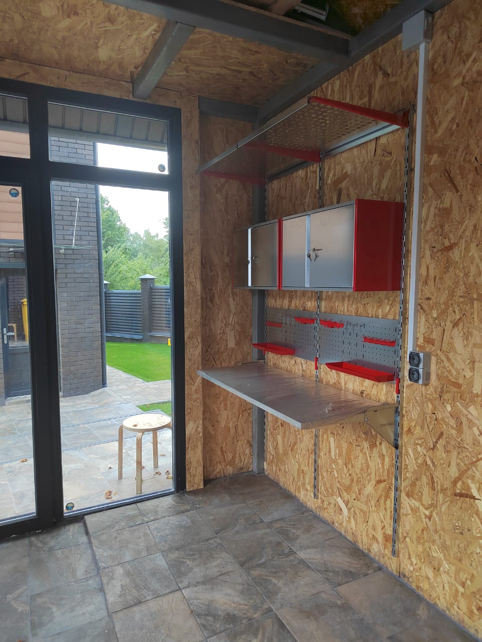 В основе проекта полки с перфорацией глубиной 315 и 520мм. Полки с перфорацией глубиной 520мм дополнительно усилены рёбрами жёсткости. Такие полки отлично подходят для хранения любых вещей. Предусмотрена рабочая зона со складным столом-верстаком, над рабочей поверхностью установили перфопанели с лотками, крючками и держателями инструментов. В рабочей зоне установили два навесных шкафчика с замком, задняя стенка шкафчика с перфорацией. В проекте добавлены крюки на полку.