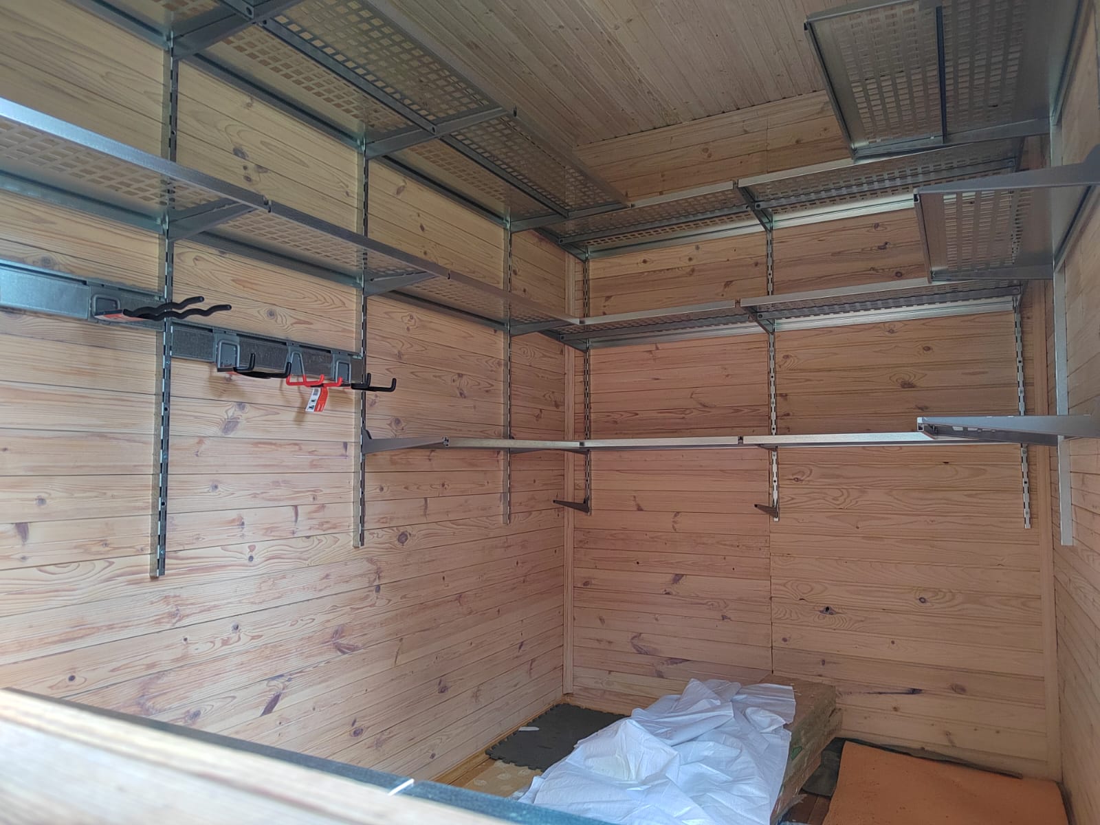 Предусмотрели полки глубиной 520 и 315мм, все полки выполнены с перфорацией, чтобы не "перегружать" конструкцию. Все перфорированные полки глубиной 520мм дополнительно усилены рёбрами жёсткости. Для хранения садового инвентаря - предусмотрели рейлинги с крюками Эссе.