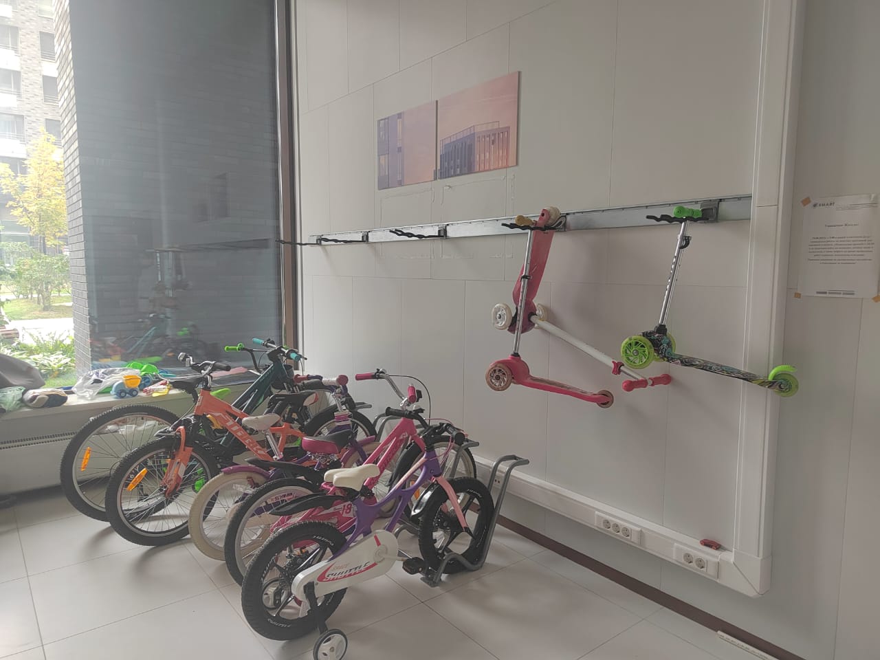 Для организации хранения велосипедов на полу - использовали вело-парковки. Самокаты и детский игровой инвентарь разместили на рейлингах с крюками Эссе.