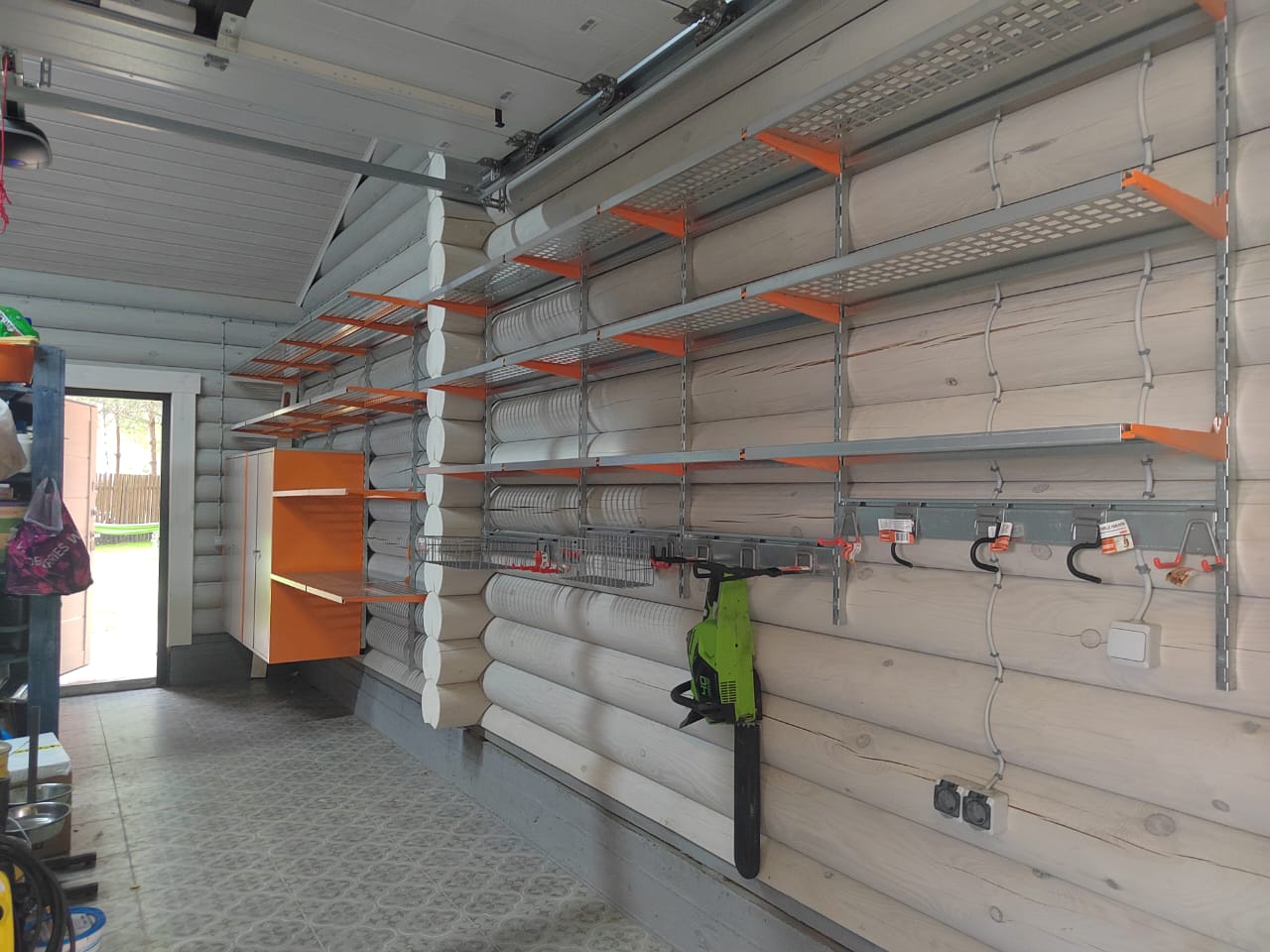 - Для хранения хозяйственного инвентаря - использовали рейлинги с крюками Эссе и стальными корзинками;