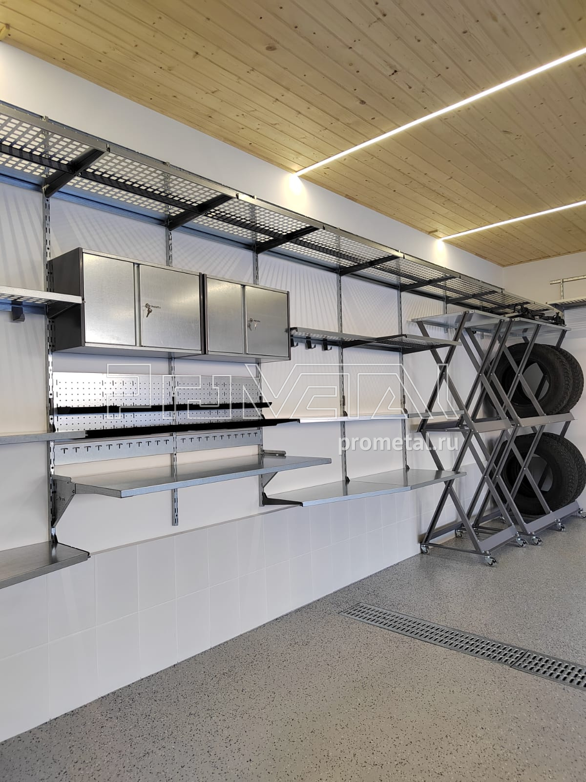 - Предусмотрена рабочая зона со складным столом-верстаком и перфопанелями с крючками, лотками и держателями инструментов. Над перфопанелями установили 2 навесных шкафчика с замками;