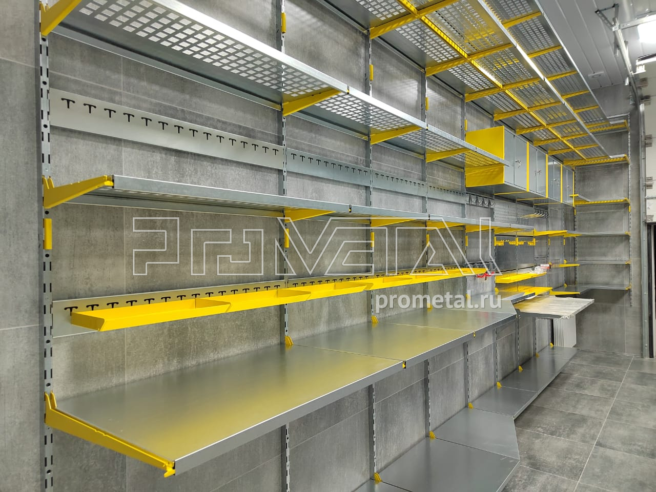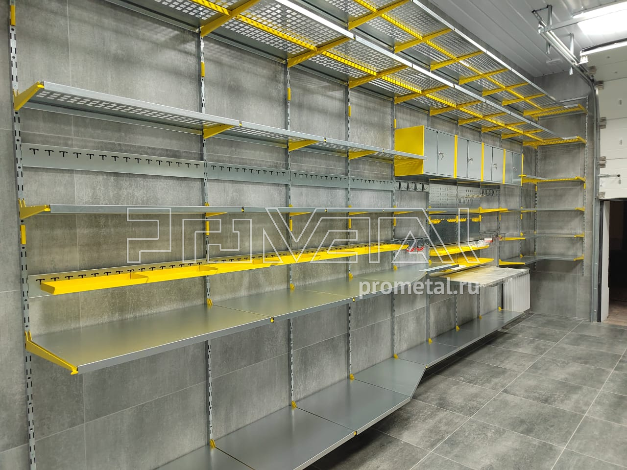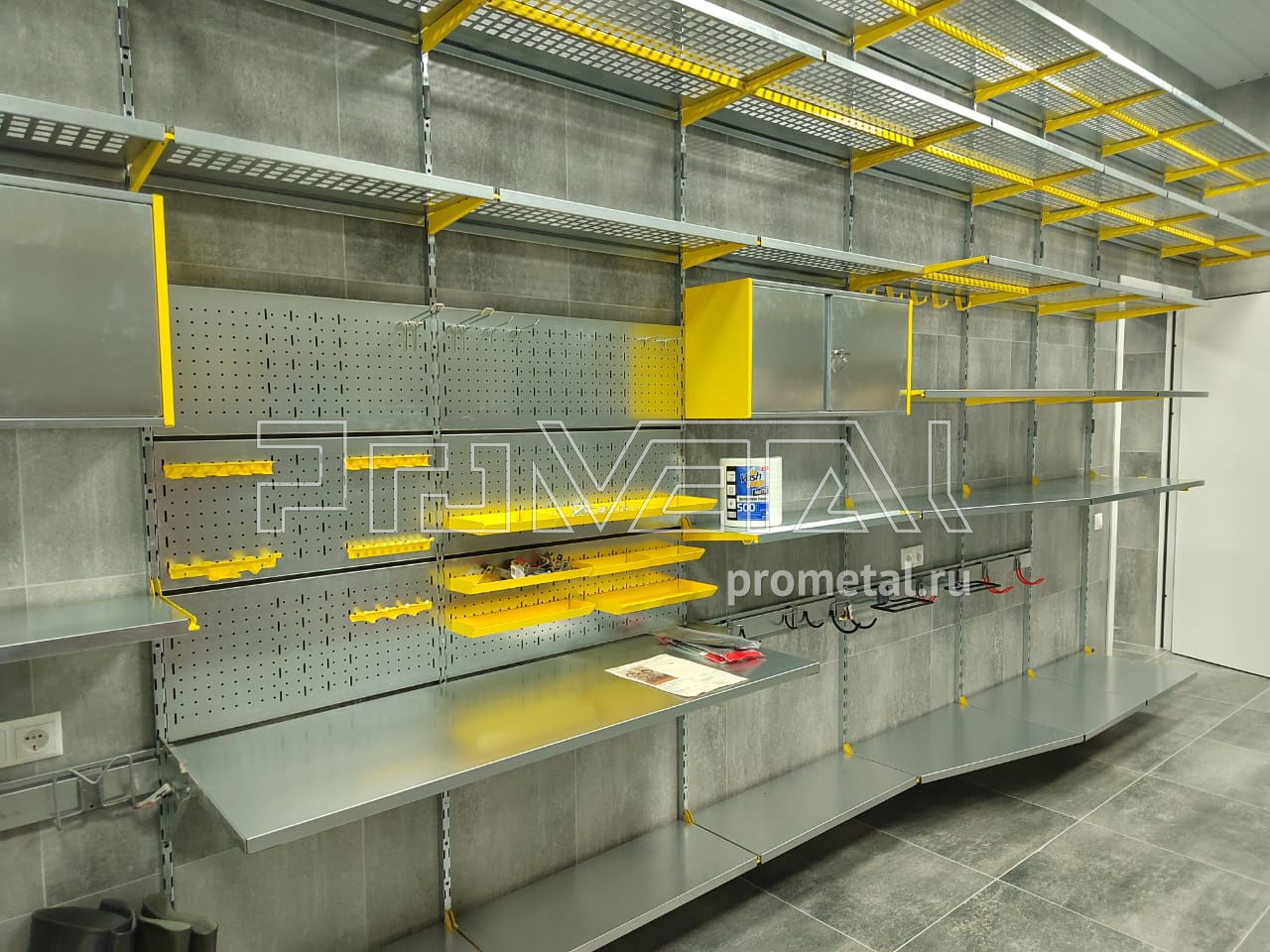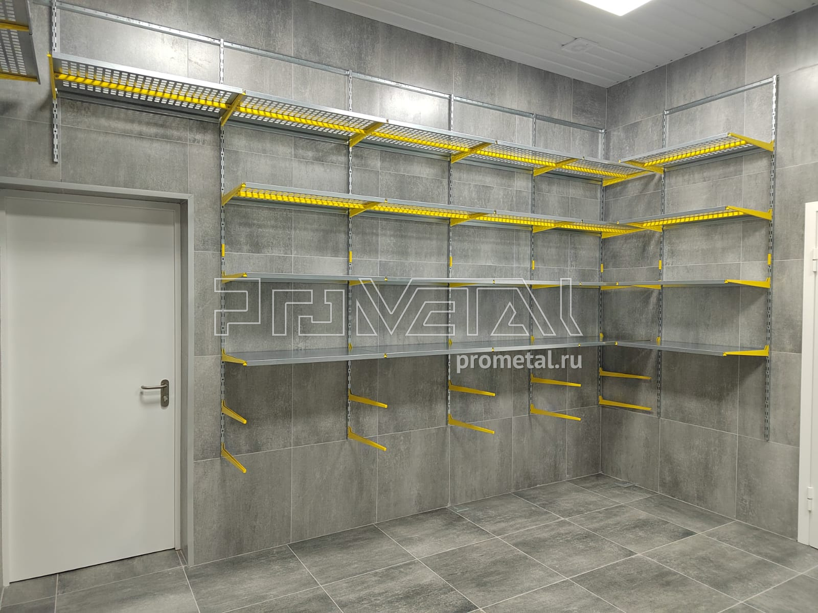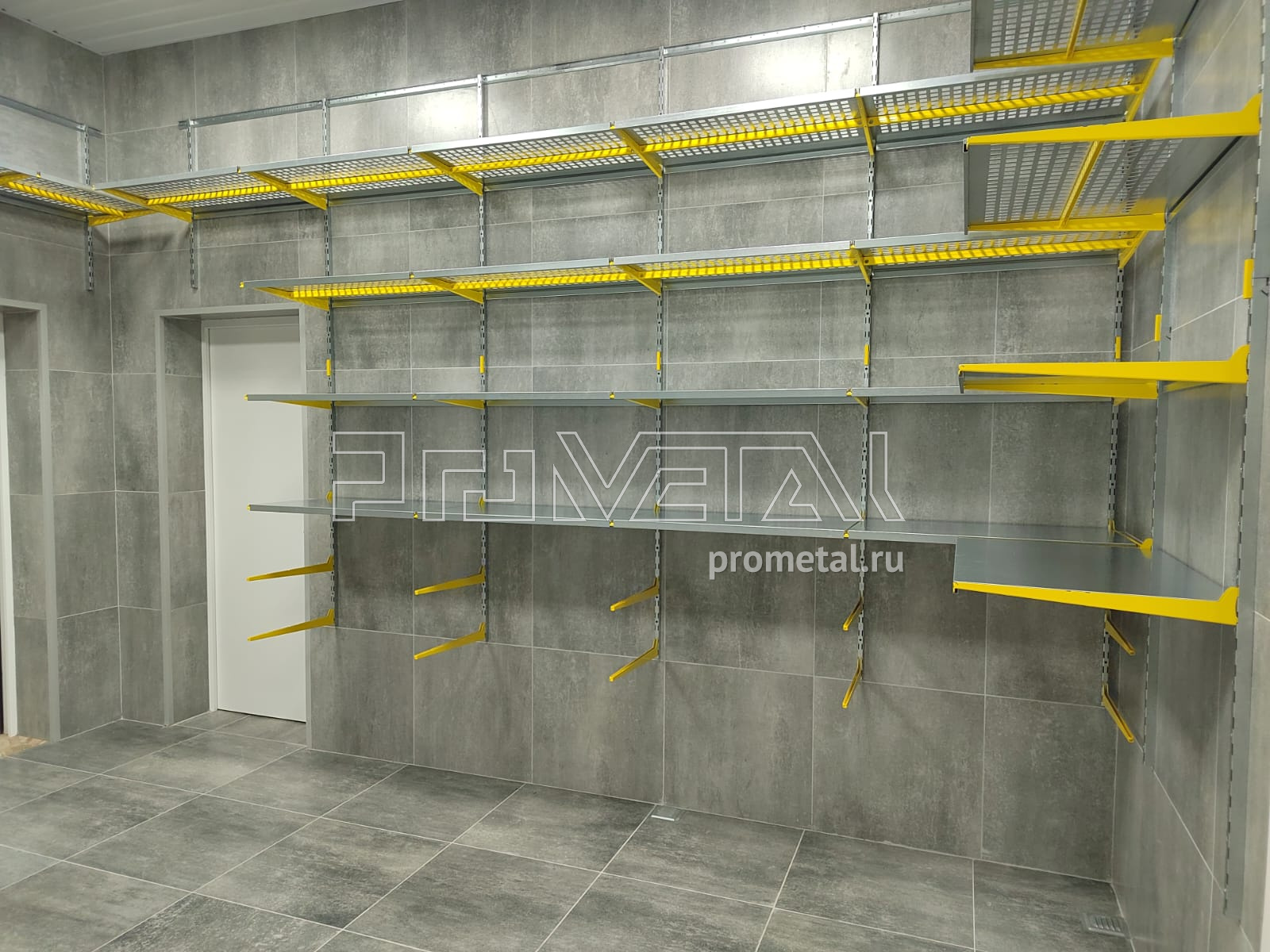 Цвет стеллажной системы, на наш взгляд, был выбран очень удачно, под серые стены - жёлтый.