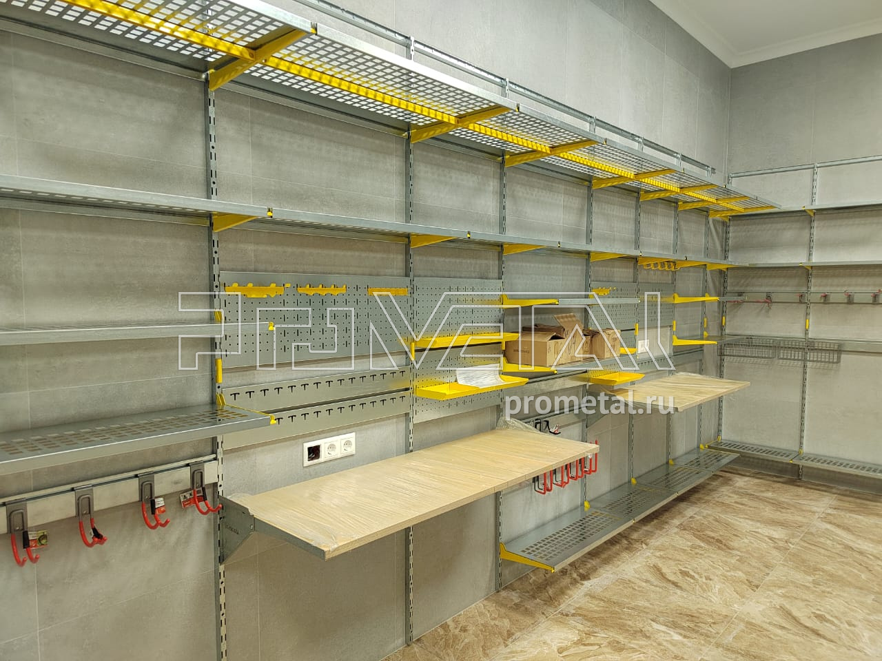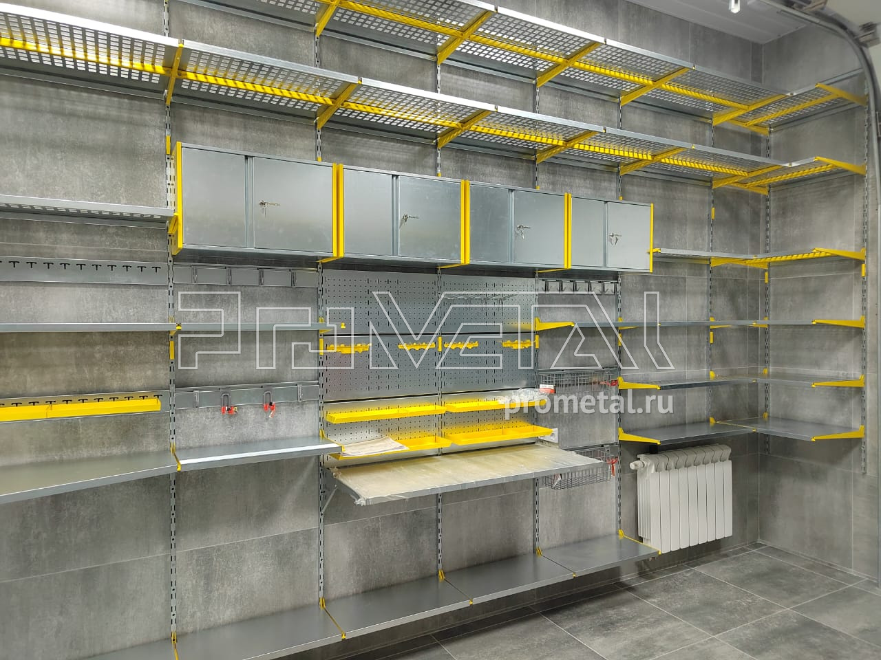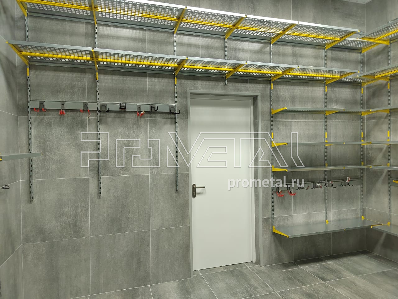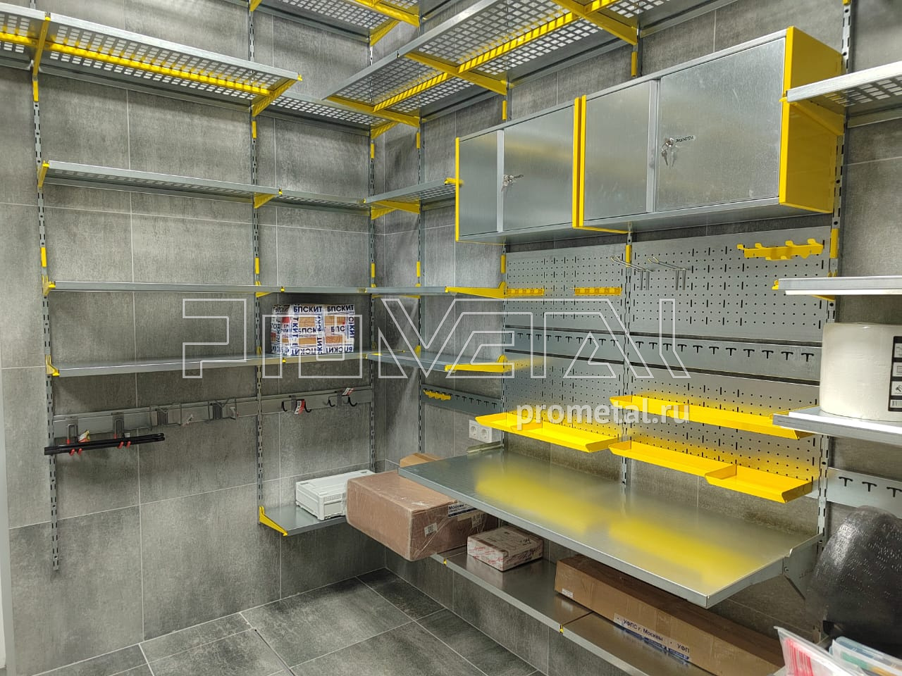 Цвет стеллажной системы, на наш взгляд, был выбран очень удачно, под серые стены - жёлтый.
