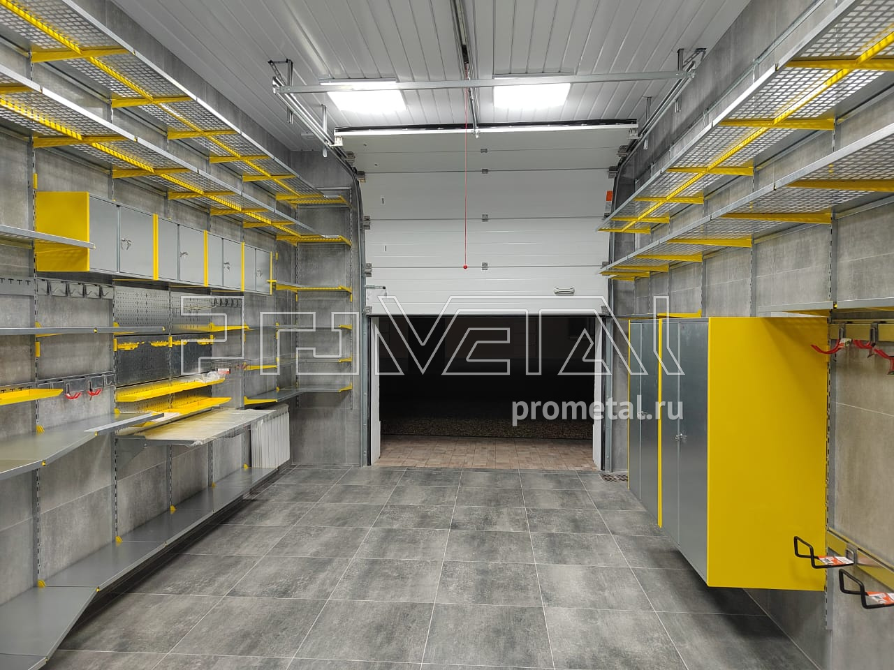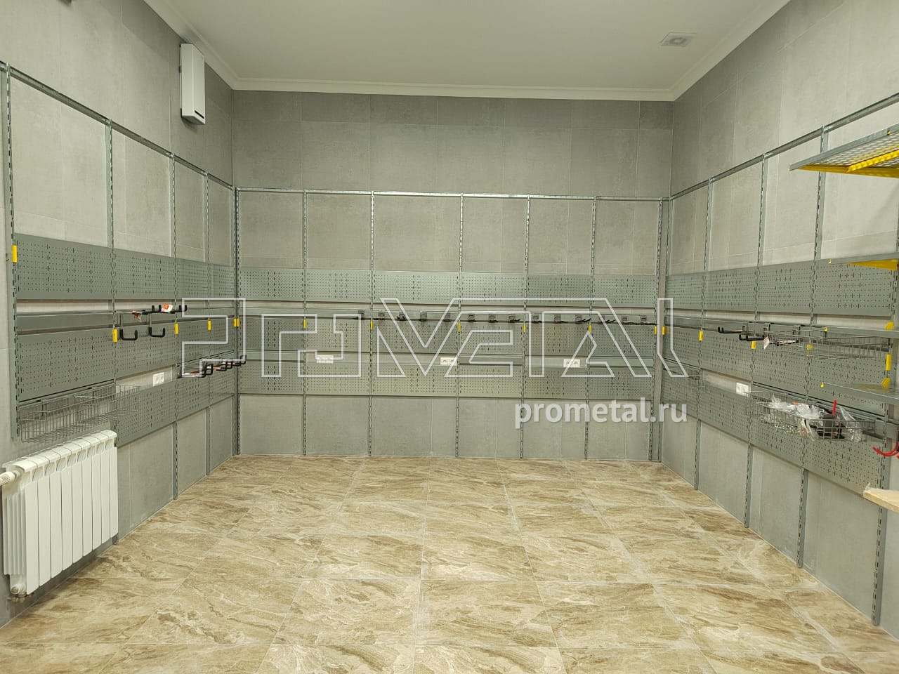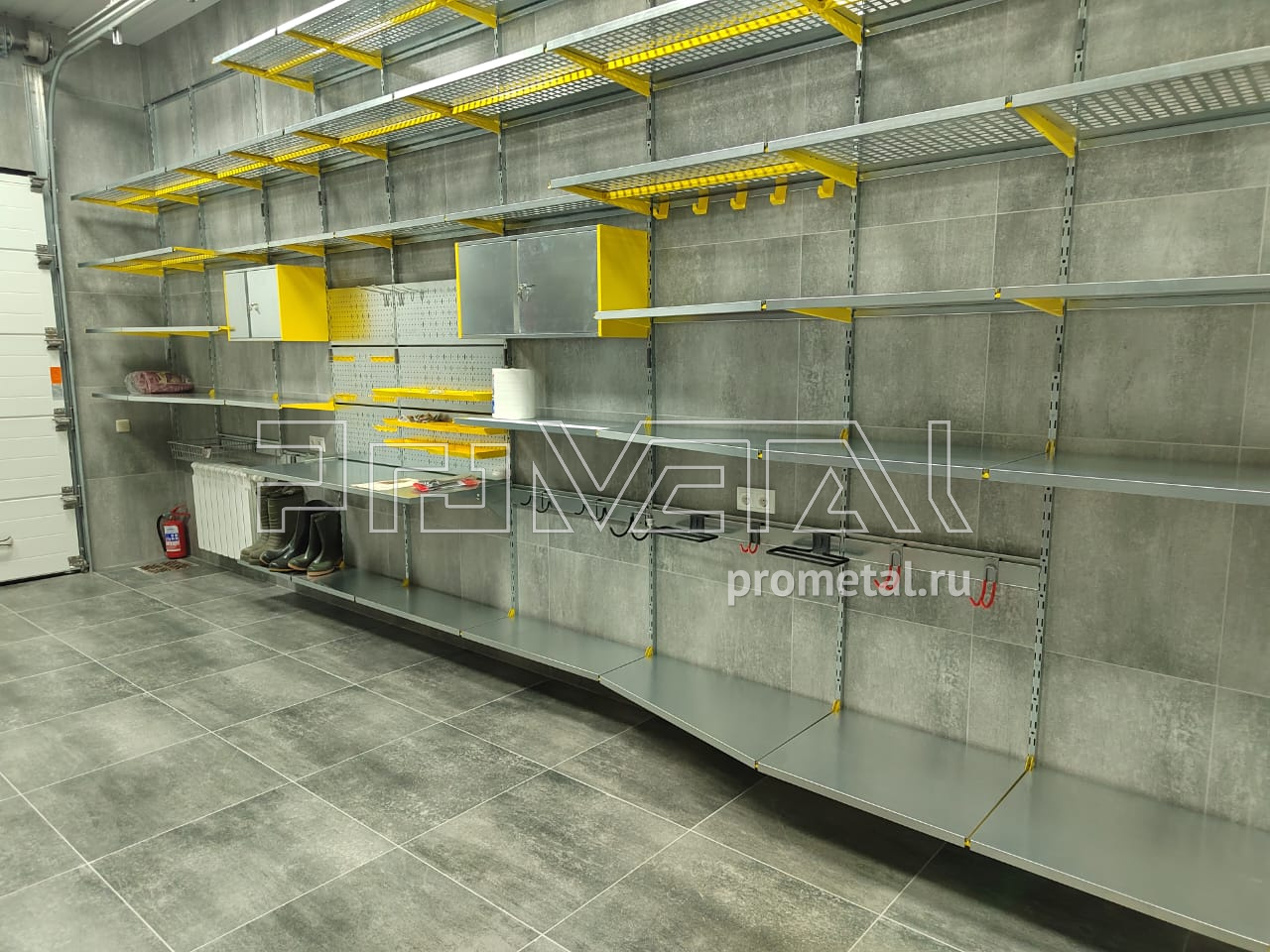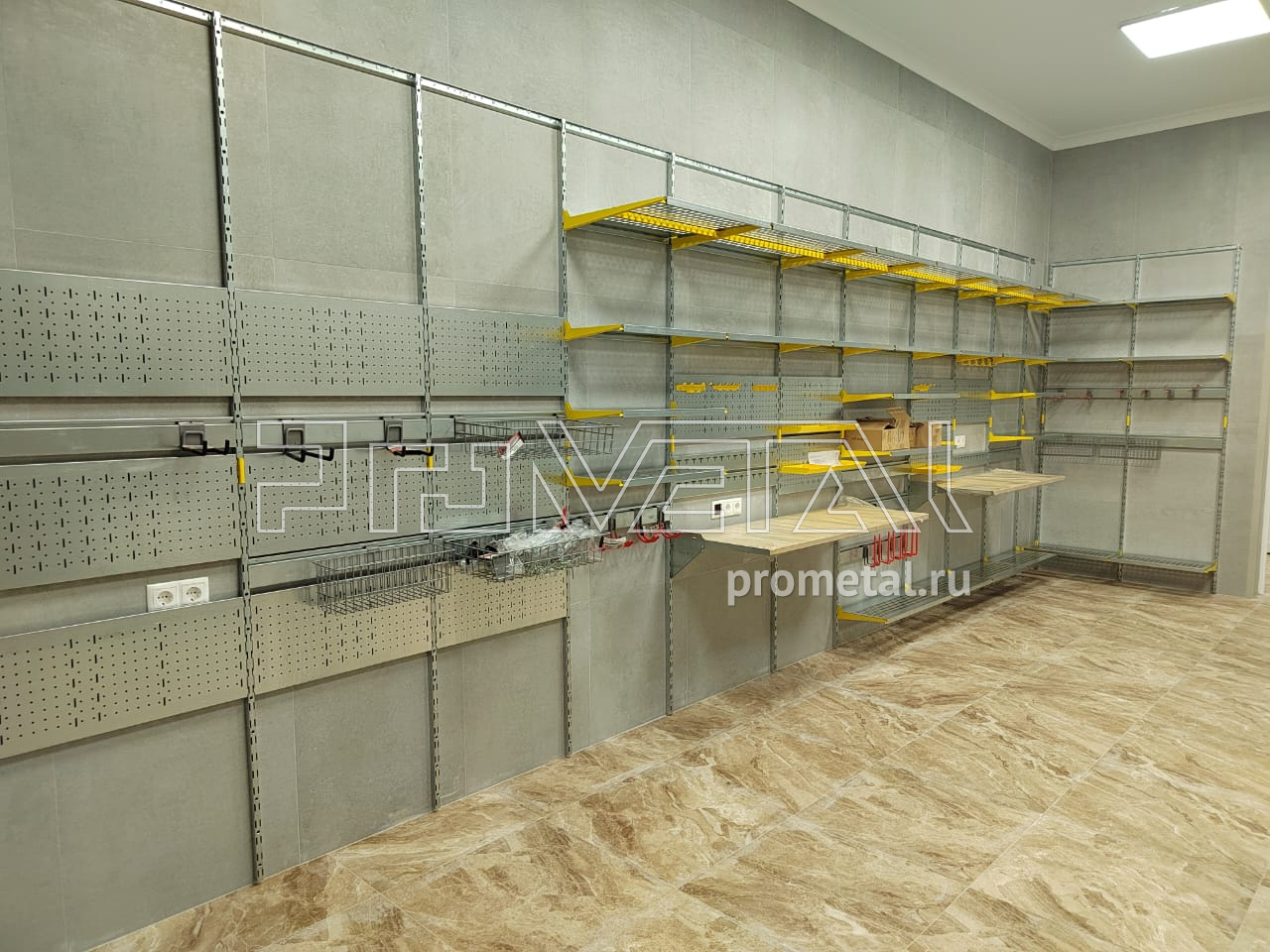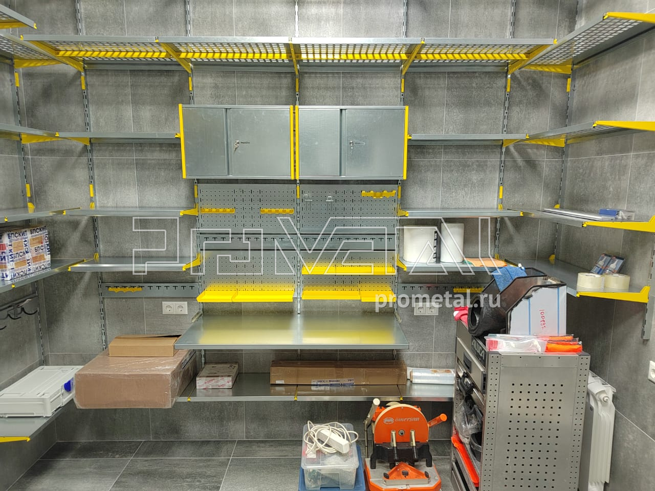 Цвет стеллажной системы, на наш взгляд, был выбран очень удачно, под серые стены - жёлтый.