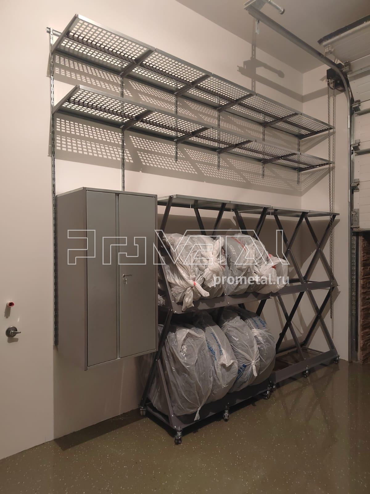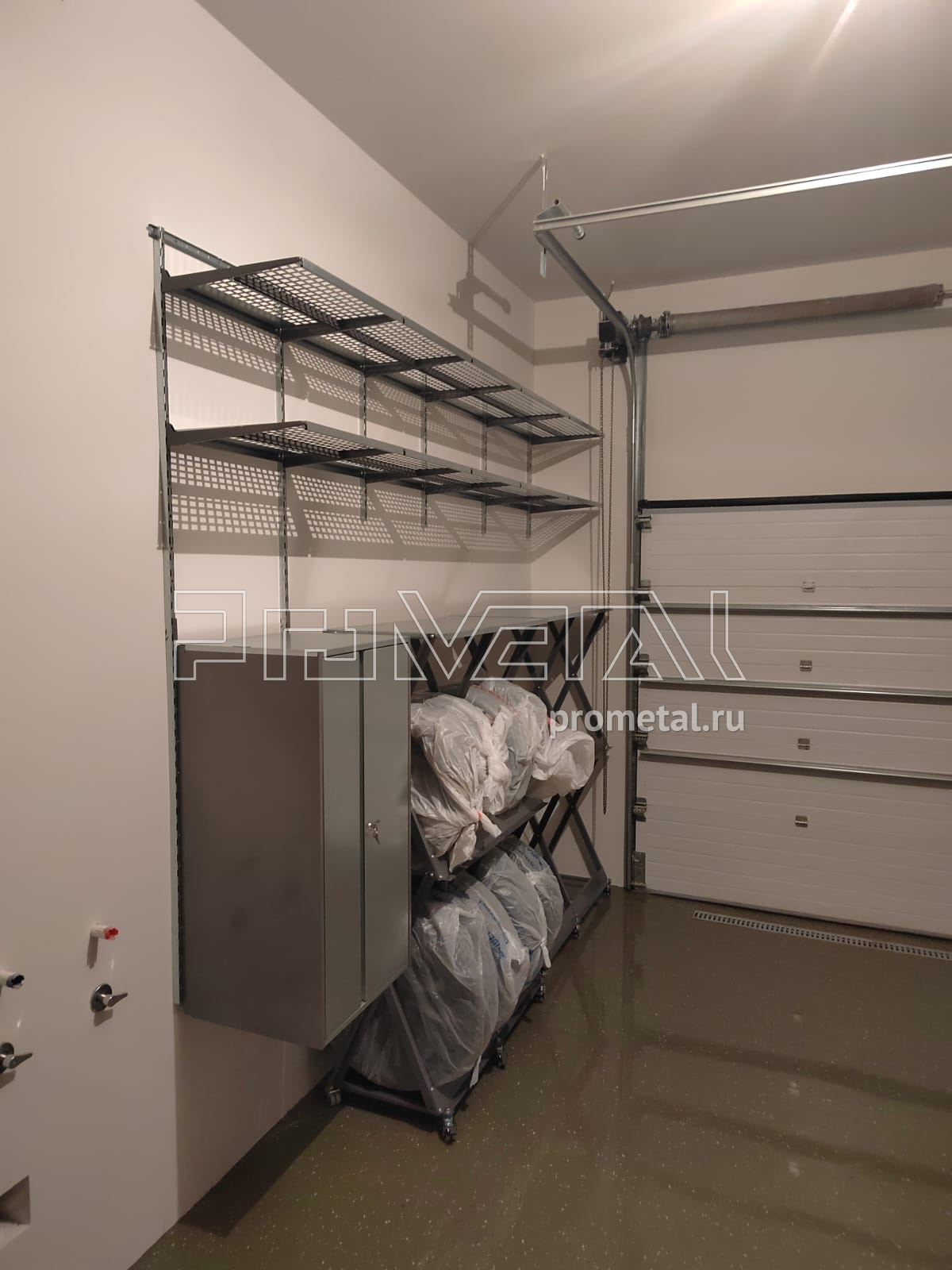 Обустройство гаража в Московской области, КП "Монтевиль". Точные размеры помещения со списком вещей, которые там будут храниться, были отправлены нам по электронным каналам связи. Проект был разработан и согласован в течение недели. Наш мастер всё привёз и смонтировал за один день.