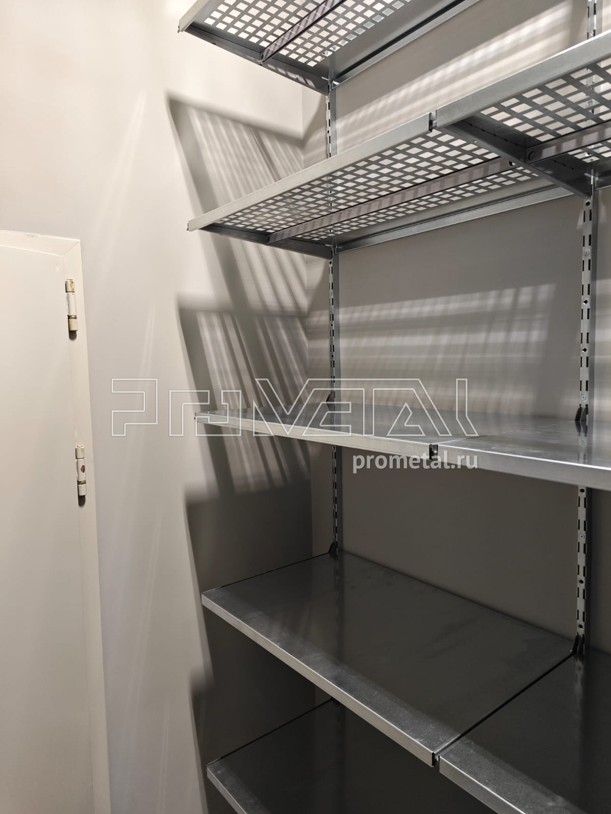 В проекте использованы цельные и перфорированные полки глубиной 315 и 520мм. На полки с перфорацией глубиной 520мм установлены рёбра жёсткости. Для хранения различного инвентаря предусмотрены рейлинги с крюками Эссе.