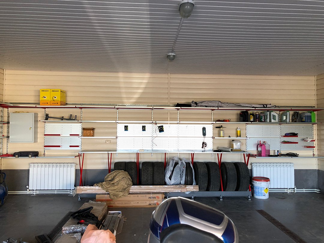 Монтаж в гараже и сарае выполнили мастера заказчика. Для этого пришлось демонтировать обшивку стен, чтобы обеспечить возможность надёжного крепления несущего каркаса. Хозяин доволен, сделал заявку на оборудование прачечной :-))