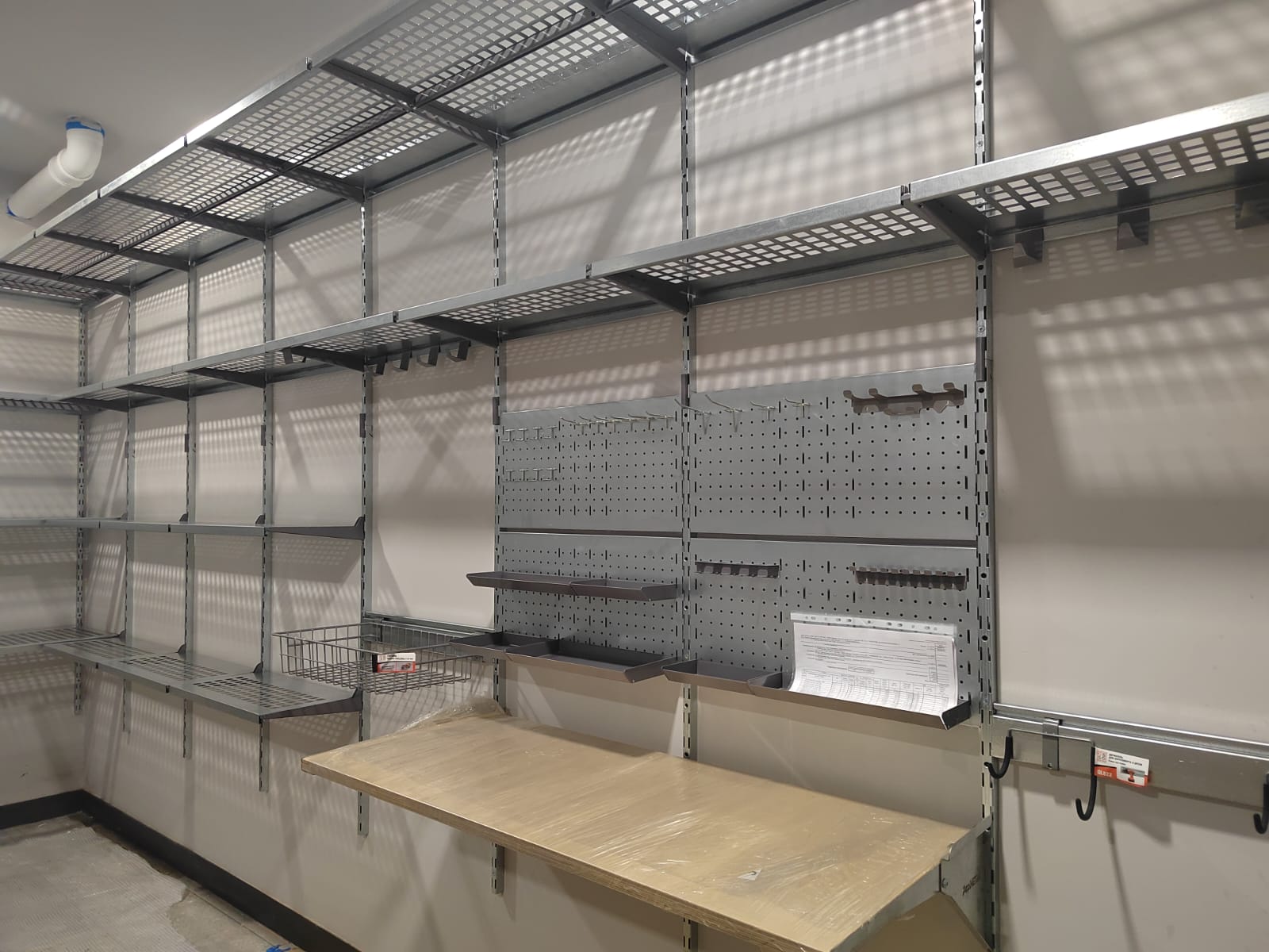 Основную площадь стен оборудовали полками с перфорацией 315 и 520мм глубиной. Перфорированные полки глубиной 520мм дополнительно усилены рёбрами жёсткости, на некоторые полки установлен усилитель кронштейна. Предусмотрели рабочую зону со складным столом-верстаком и перфопанелями, для крючков, лотков, держателей инструментов.
