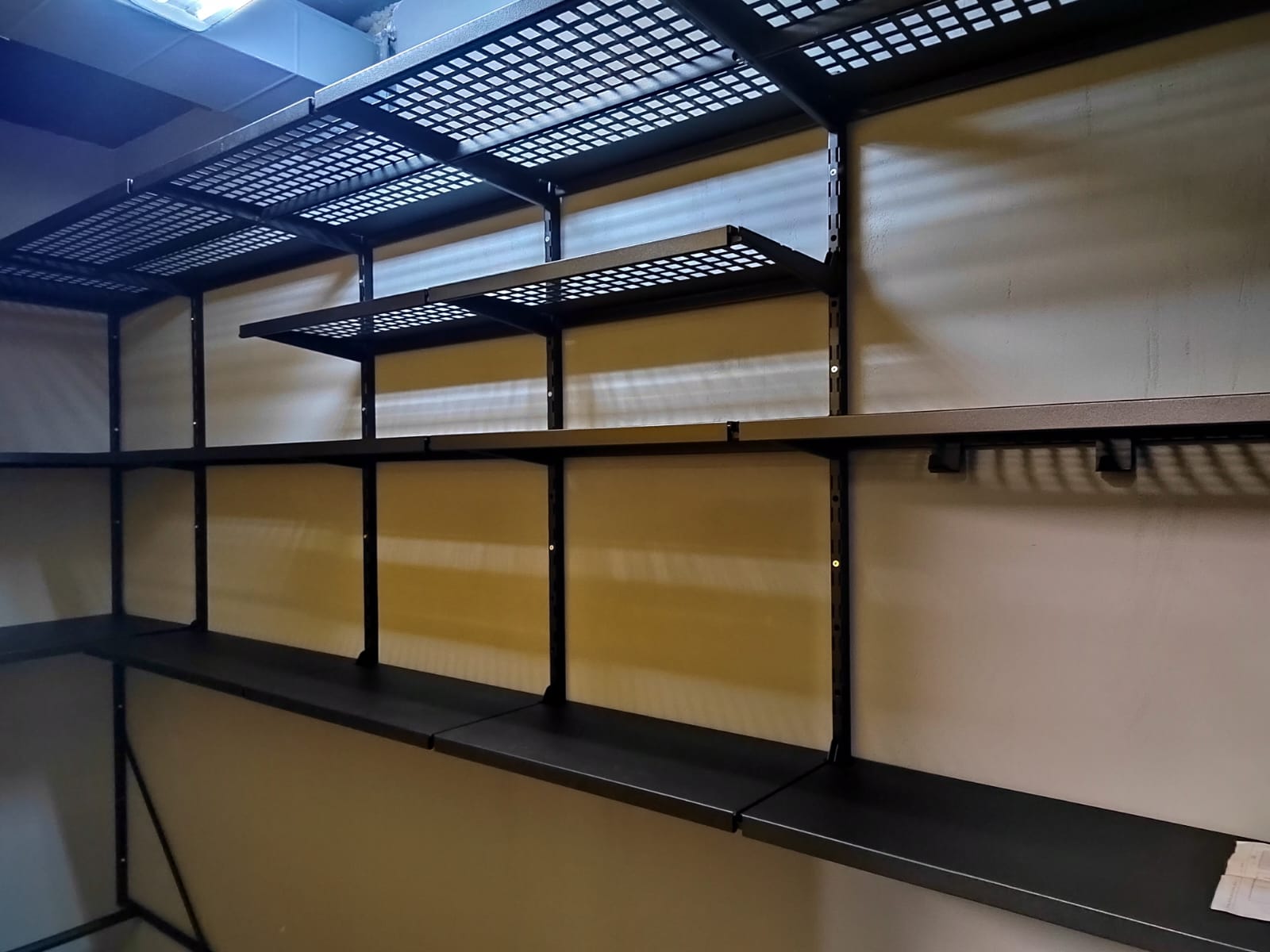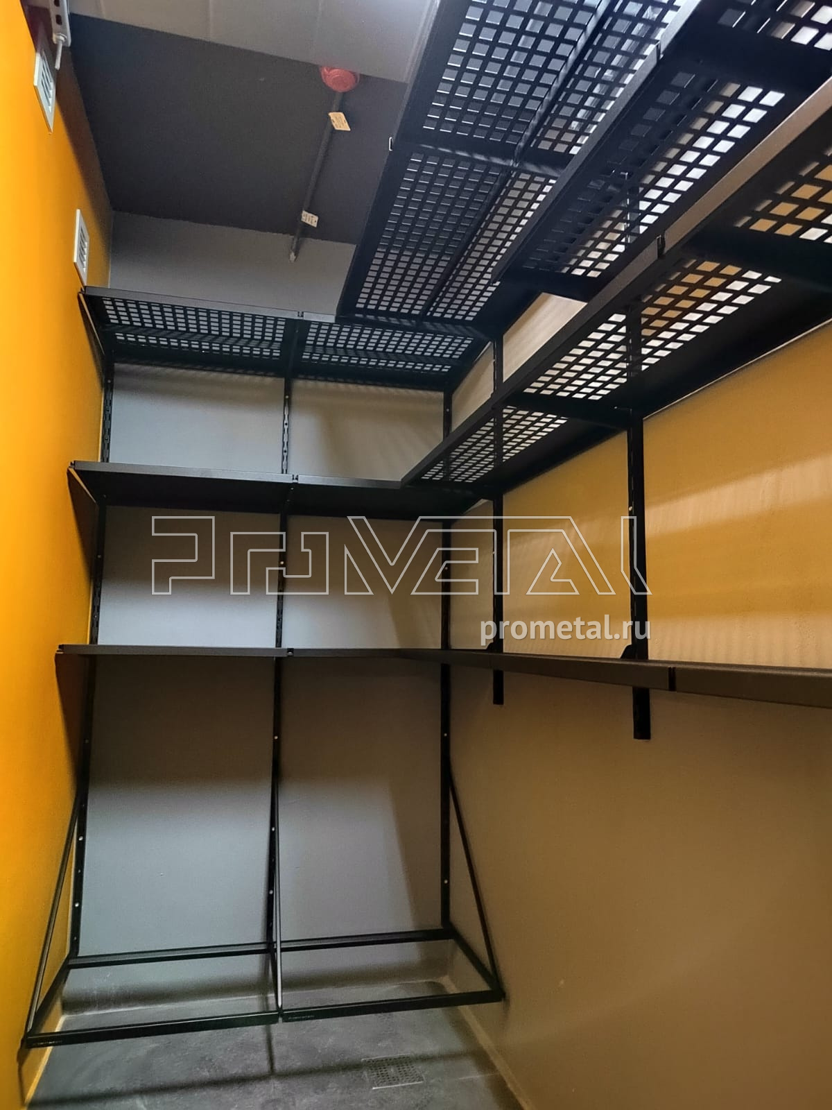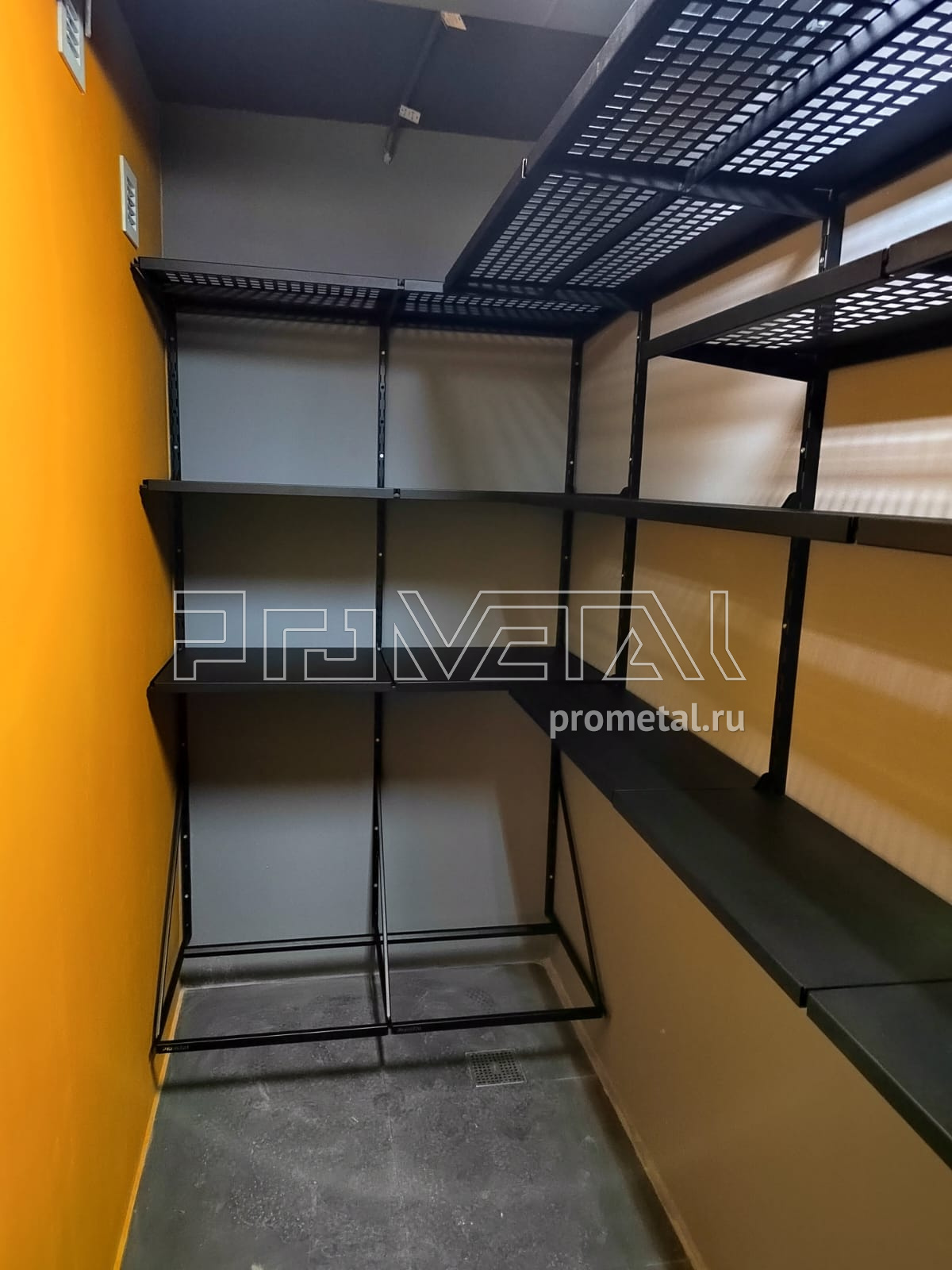 В проекте задействованы перфорированные и цельные полки глубиной 315 и 520мм. Глубокие перфорированные полки 520мм усилены рёбрами жёсткости. В углу предусмотрели специальные подвесы, для хранения комплекта колёс. В проект добавлены крюки на полку.