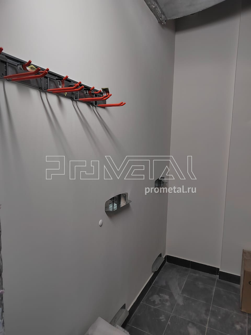 В проекте задействованы цельные и перфорированные полки глубиной 520мм. Все полки с перфорацией усилены рёбрами жёсткости. Предусмотрены штанги для плечиков, под хранение сезонной одежды. Взрослые велосипеды храним на Вело-подвесе на стену за педаль, детские велосипеды - на специальных крюках на полку. Предусмотрен рейлинг с крюками Эссе, для хранения 4 пар лыж. В проект добавлены крюки на полку.