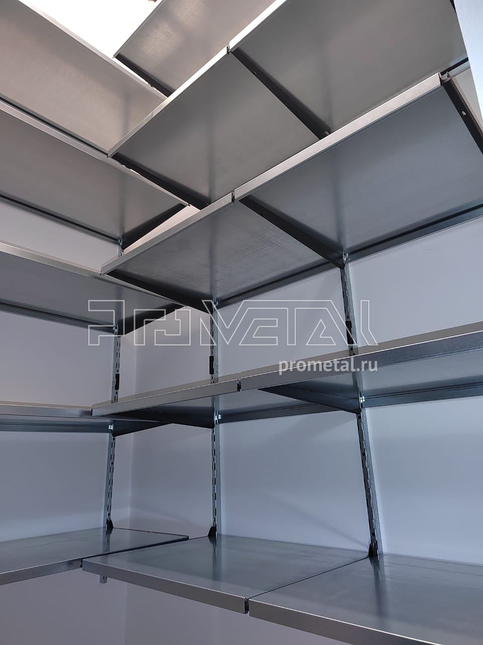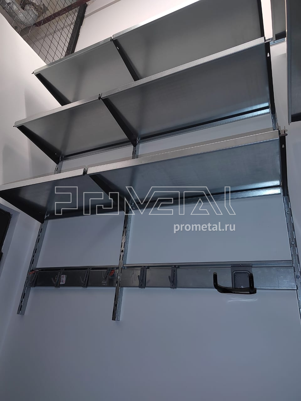 В проекте использовали цельные полки глубиной 315 и 520мм. Для хранения различного инвентаря и стремянки, предусмотрены рейлинги с крюками Эссе.