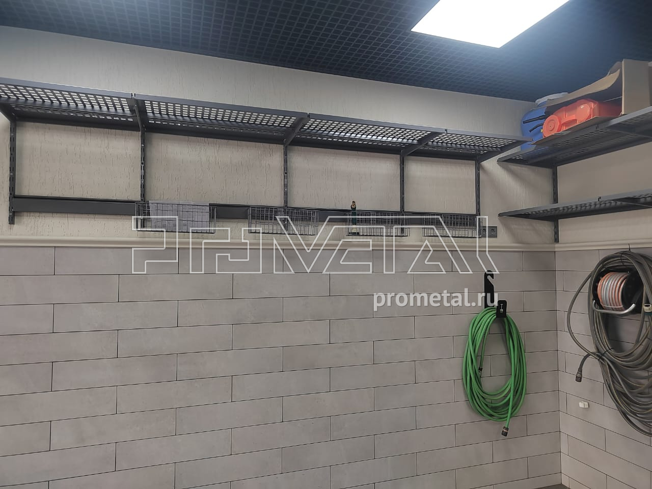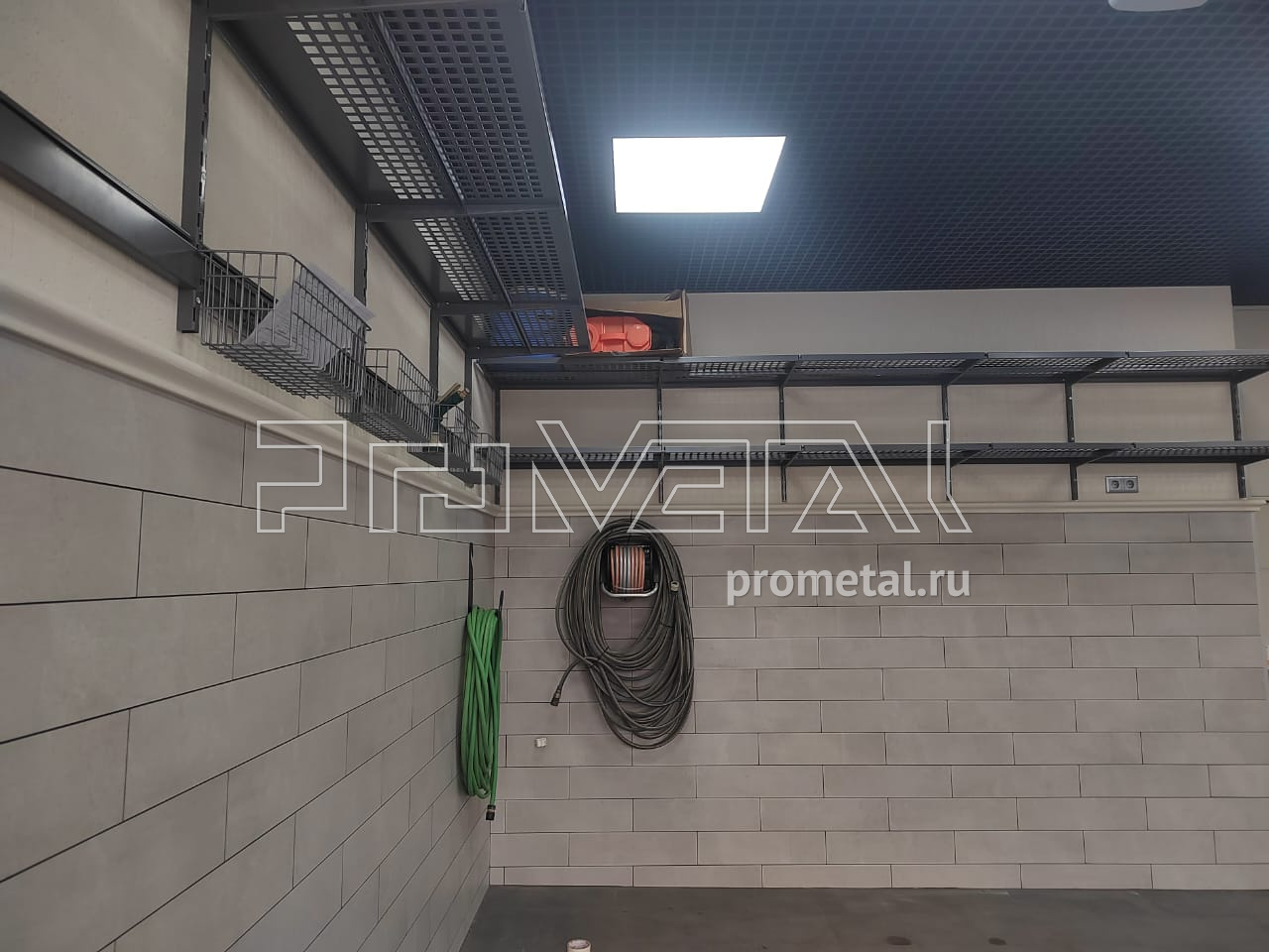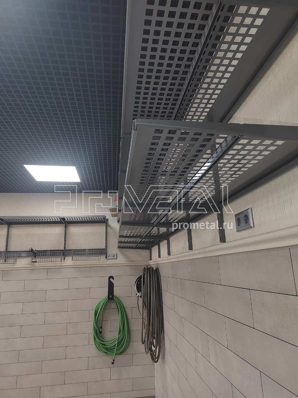В проекте использовались перфорированные полки глубиной 315 и 520мм. Все полки с перфорацией глубиной 520мм усилены рёбрами жёсткости. Предусмотрены рейлинги со специальными крюками Эссе и стальными корзинками, для хранения хозяйственного, садового и другого различного инвентаря.