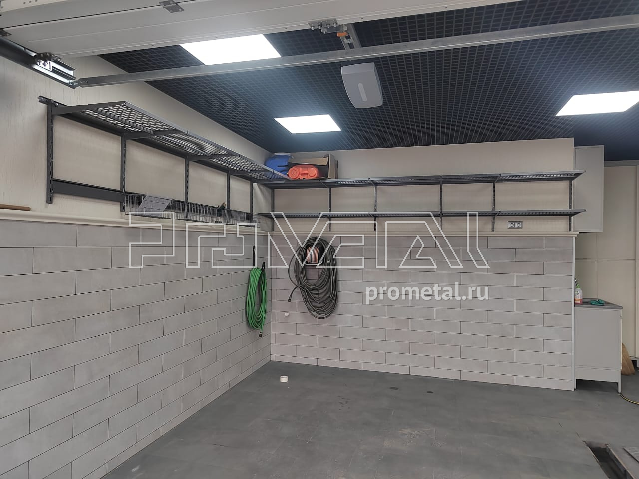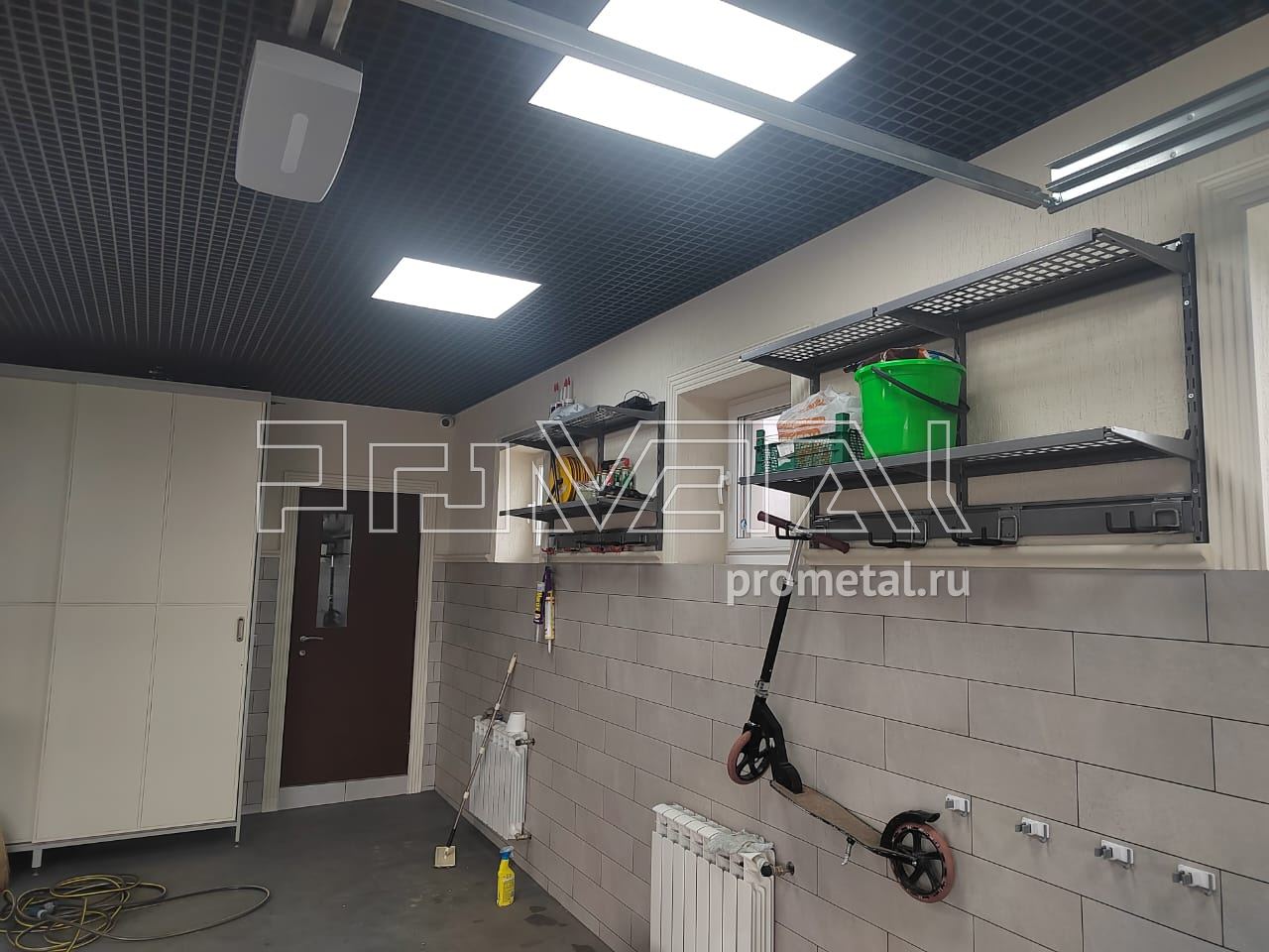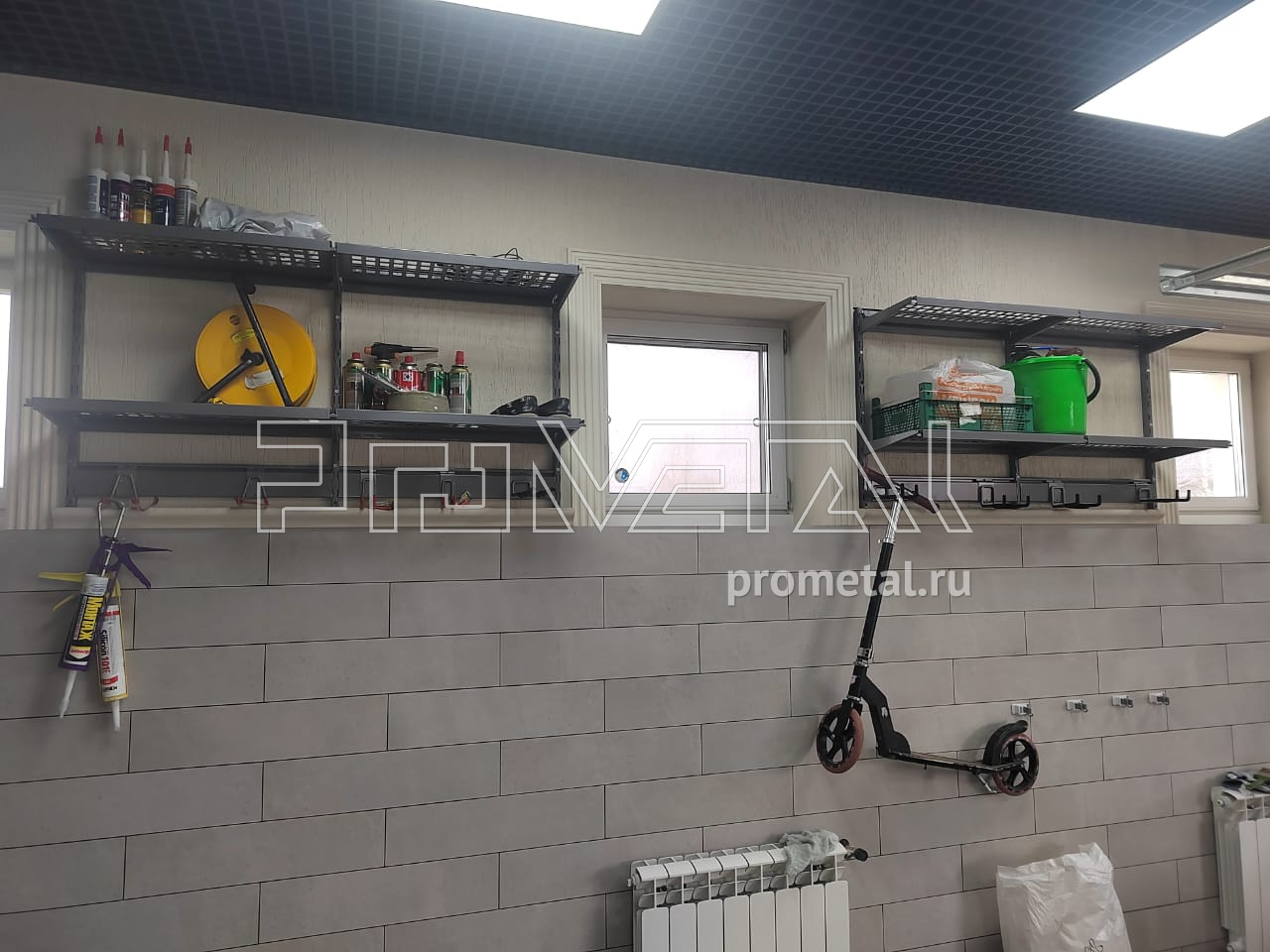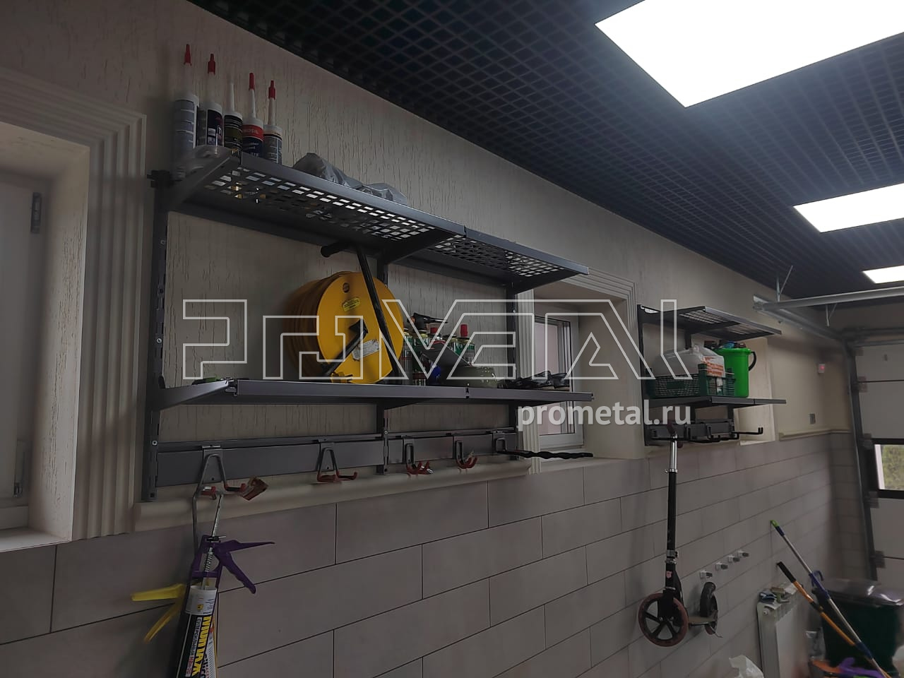 В проекте использовались перфорированные полки глубиной 315 и 520мм. Все полки с перфорацией глубиной 520мм усилены рёбрами жёсткости. Предусмотрены рейлинги со специальными крюками Эссе и стальными корзинками, для хранения хозяйственного, садового и другого различного инвентаря.